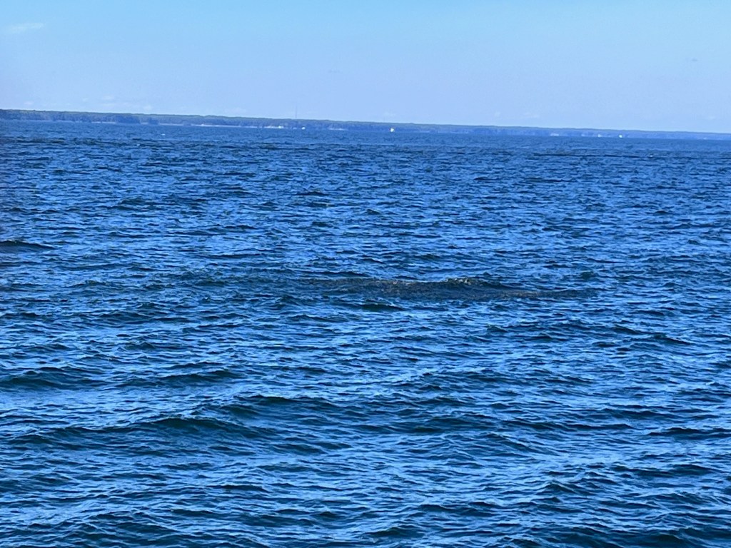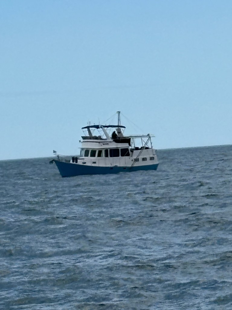 It was a sunny day, with dolphins to Duke’s delight, and a sharp look out for whales which were migrating through the area (but never seen by us — or Duke!) We were about three miles offshore the entire way and, as the rolling got under control, we began to relax and enjoy the journey that we had dreaded for so long.