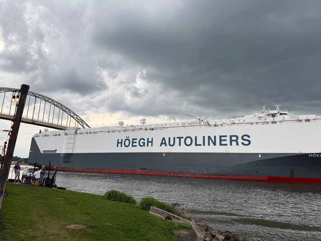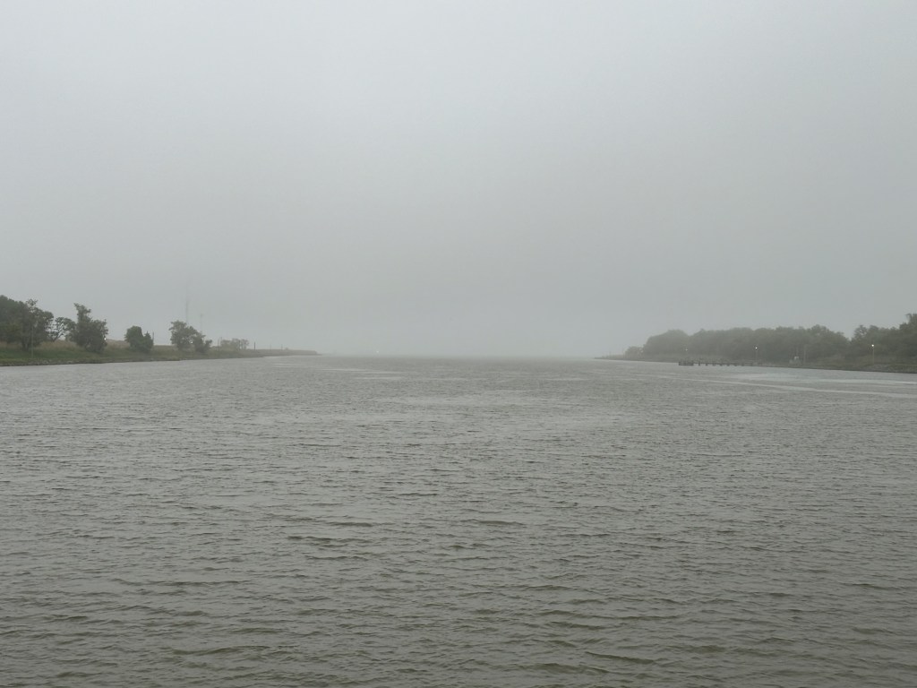 It was a smooth run up the bay and we entered the Chesapeake-Delaware Canal around 2:00 pm after a 50 mile run past familiar territory. This was the beginning of new worlds for us. We found Chesapeake City Marina very hospitable and the food a Bayard House next door to be world class. During dinner, a huge auto carrier appeared in the canal and the size of it was frightening. There were storms that evening and the next day with dramatic cloud formations.
