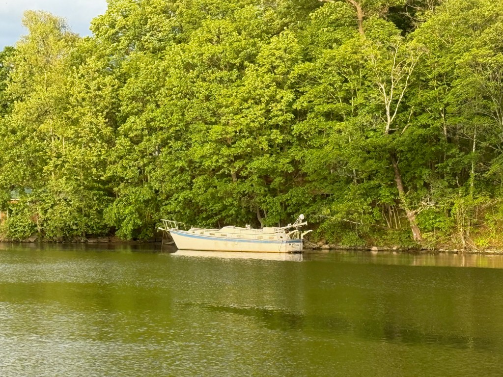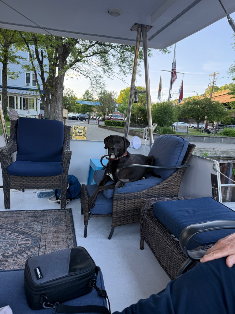 Kingston is lovely, a town on the Hudson River, steeped in Naval and other sea-going lore. It has a marine museum, a wooden boat building operation, and an “obsolete fleet” where older models of boats are restored. And right alongside our dock in the marina there, we watched local high school crew teams practice their (very fast!) rowing. Still we were not willing to stay there for weeks on end. So… we got a one-way rental car, and drove ourselves and the pets back to Baltimore, where we greatly enjoyed spending time with family and friends for 10 days. Then back to Kingston on Monday, June2.  News on progress with the Erie Canal was optimistic but nonspecific. We decided to go further North toward the canal, and are staying in the Shady Harbor Marina in New Baltimore (!), New York. (Haven’t yet found out the town’s relationship to old Baltimore.)