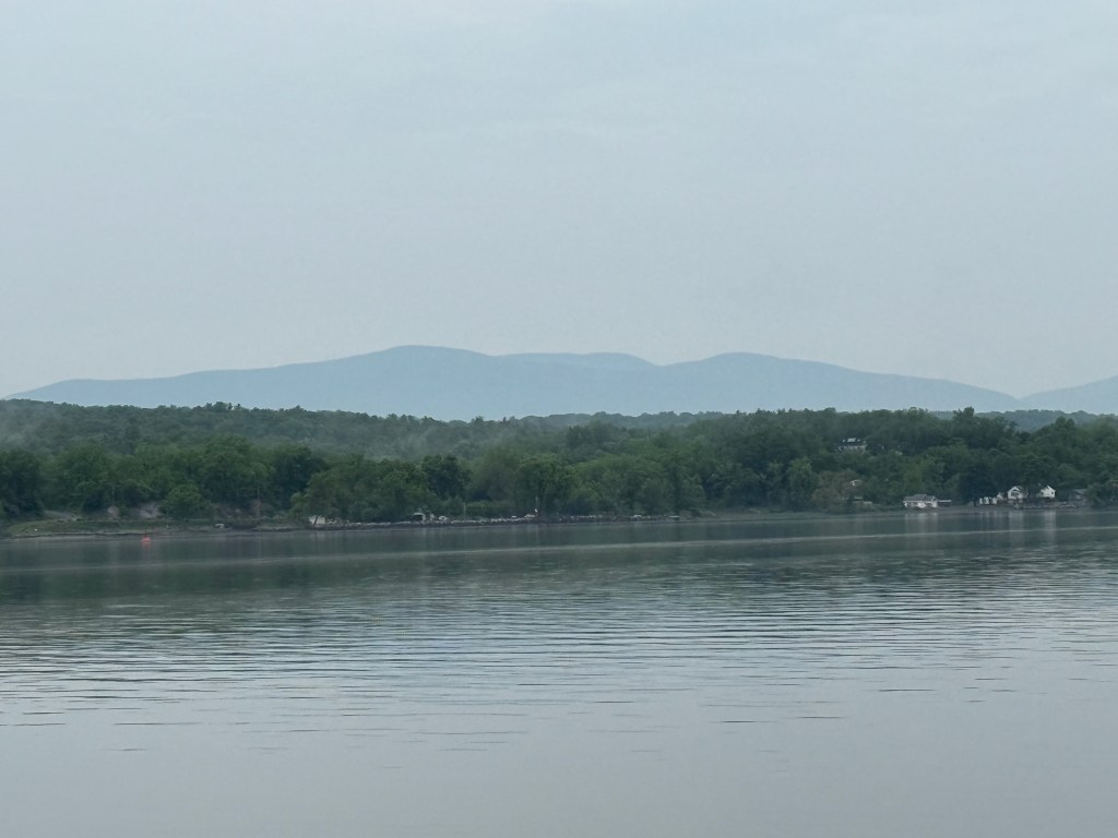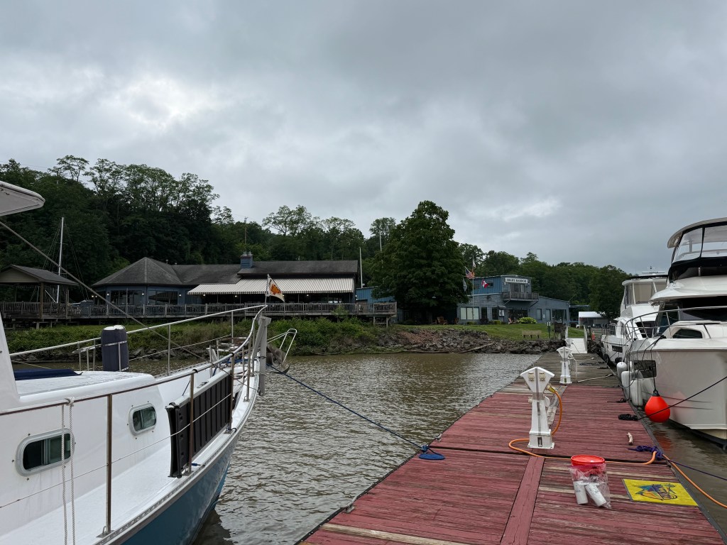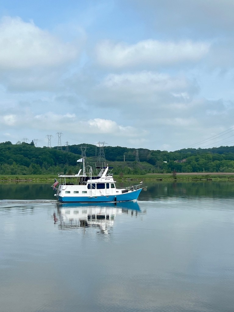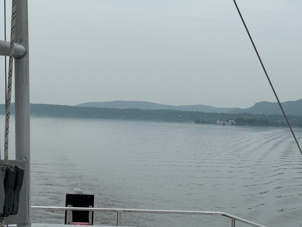 The trip from Kingston to New Baltimore was beautiful and easy: 34 miles that took about 4.5 hours. The sky was partly cloudy, hinting at rain to come, and the tidal current was helping us out with an additional knot of speed. We said goodby to our new friends in Kingston (George and Robin, Peter, Steve, George, and the two Patricks) and to the Catskills that loomed in the northwestern distance.