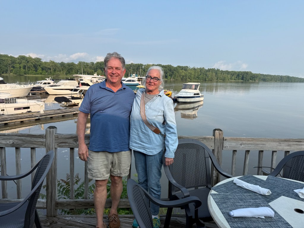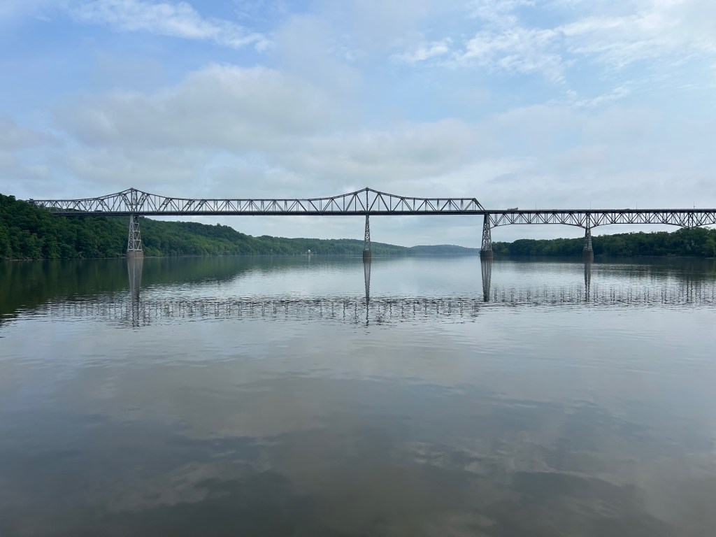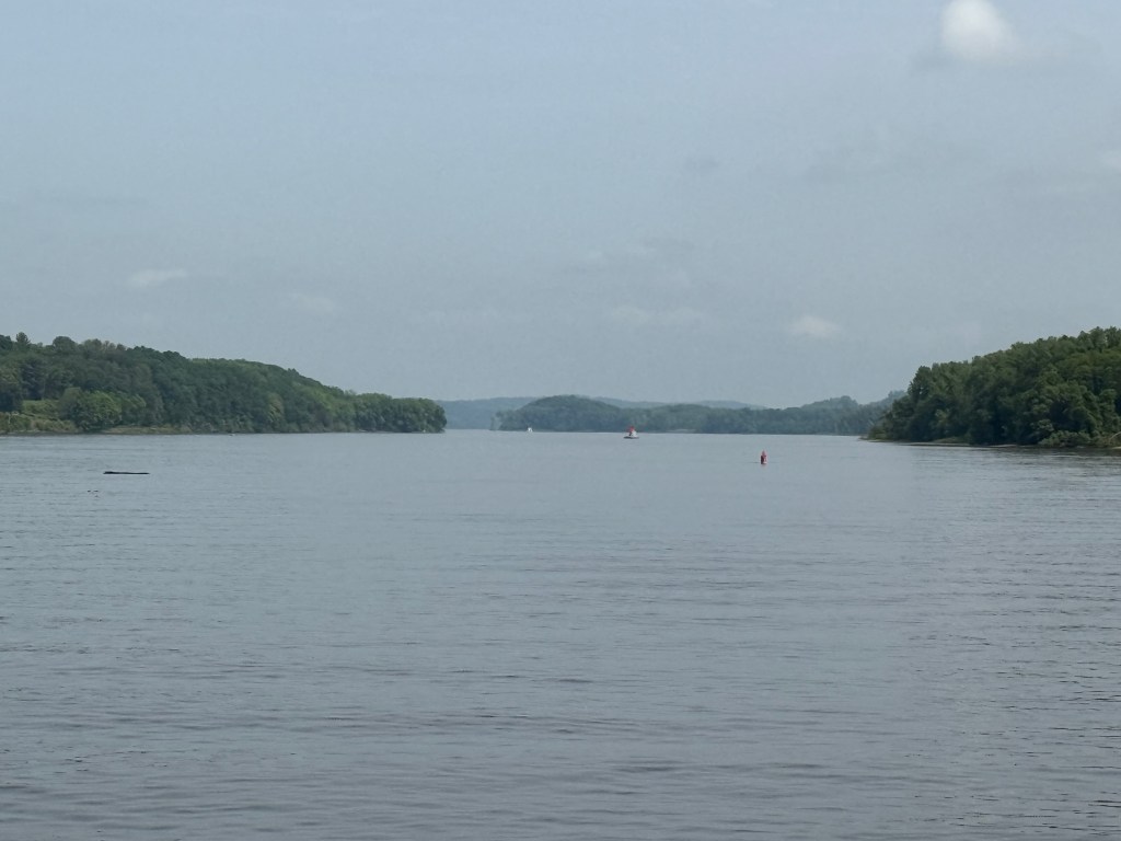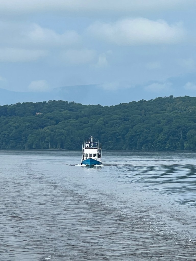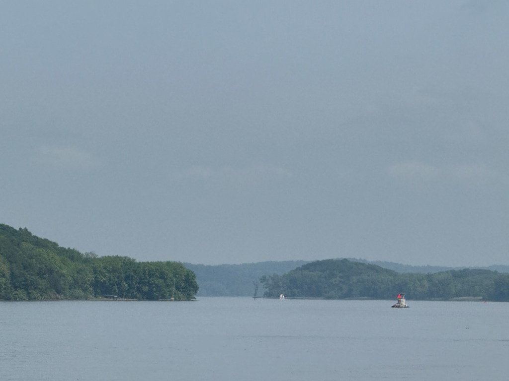 The trip from Kingston to New Baltimore was beautiful and easy: 34 miles that took about 4.5 hours. The sky was partly cloudy, hinting at rain to come, and the tidal current was helping us out with an additional knot of speed. We said goodby to our new friends in Kingston (George and Robin, Peter, Steve, George, and the two Patricks) and to the Catskills that loomed in the northwestern distance.
