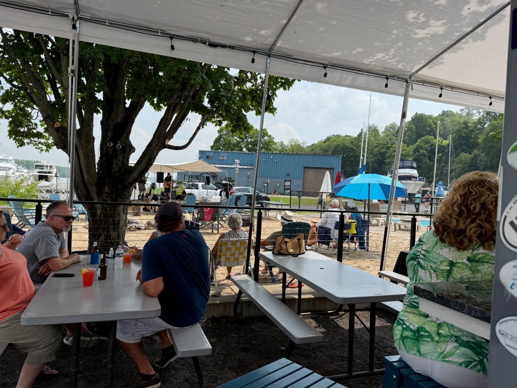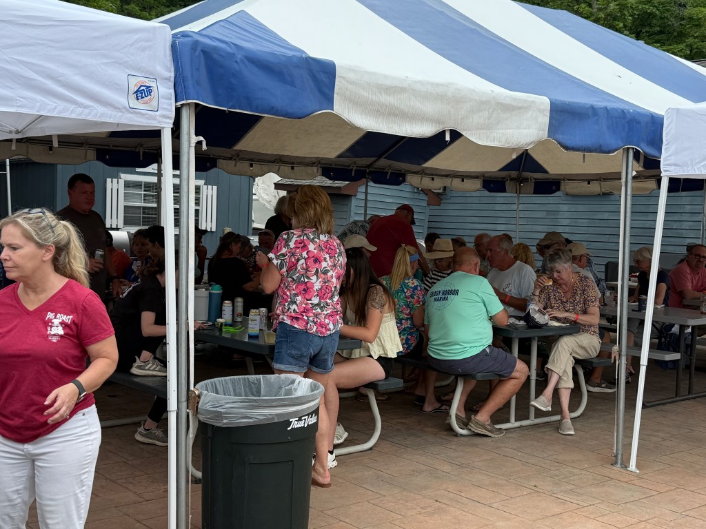 We came to Donovan’s Shady Harbor Marina to attend the pig roast on Sunday. Along the way, we encountered the largest group of “Loopers” we had seen so far. One of them, on the 29 foot “Texas True” earned his platinum flag for completing the loop for a second time. His first trip around was in a 17 foot Boston Whaler Montauk that he took on the Down East loop (around Maine and Gaspe, up the St. Lawrence) as well as the Great Loop!