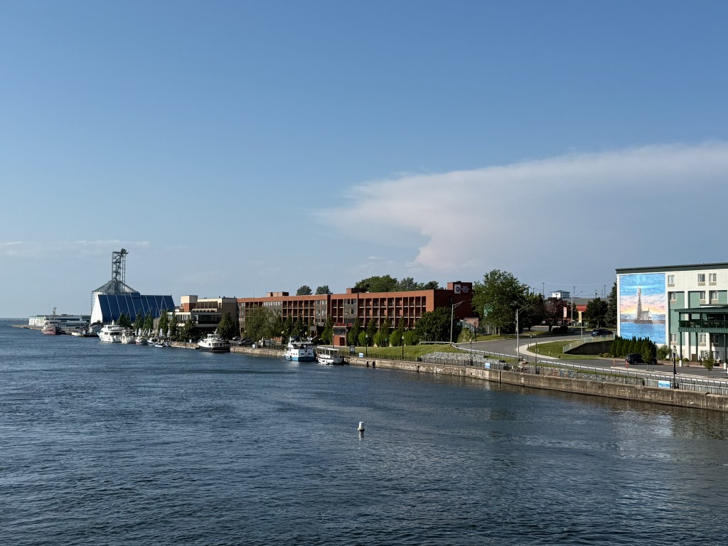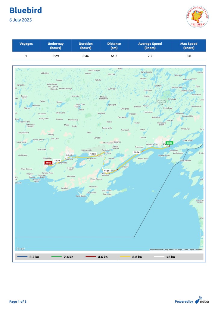 We stayed in Kingston on July 5 and Hervey went in search of materials to fix the captain’s chair. We got our Ontario fishing licenses and generally spent time recovering. We had a fabulous dinner at Chez Piggy (https://chezpiggy.ca/home/) following the recommendations of some fellow boaters who were eating there two nights in a row! With our pockets full of Canadian dollars and our “elbows out” (the Canadian symbol of resistance to the current overtures from the US government) we prepared for our trip to Trent, Ontario and the beginning of the Trent-Severn Waterway to take us to Georgian Bay.