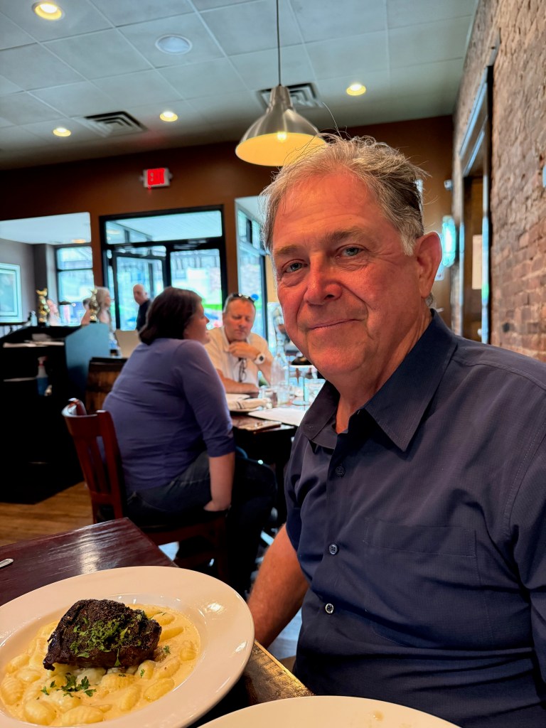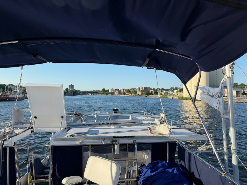 We stuck our nose into Lake Ontario on July 3, but the wind was up from storms the night before and the waves were just too much. Discretion being the better part of valor, we stayed an extra day in Oswego and went out to a restaurant recommended to us by an Uber driver that turned out to be a championship recommendation. Fabulous food and fabulous drinks! (The drinks menu was a work of art! https://www.bistro197.com/menus/#/inspired-spirits ) We had a great conversation with three local folks at the bar while we waited for our table: one was the widow of an astrophysicist who also served as a university president, the others were a couple who had retired from careers in the airline industry — he as a pilot and she as a flight attendant. And she had gone to school in Minetto with our mechanic, Kevin Rooky!