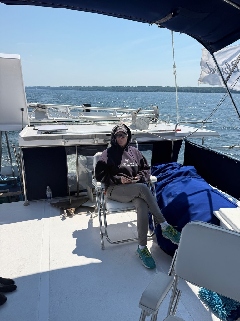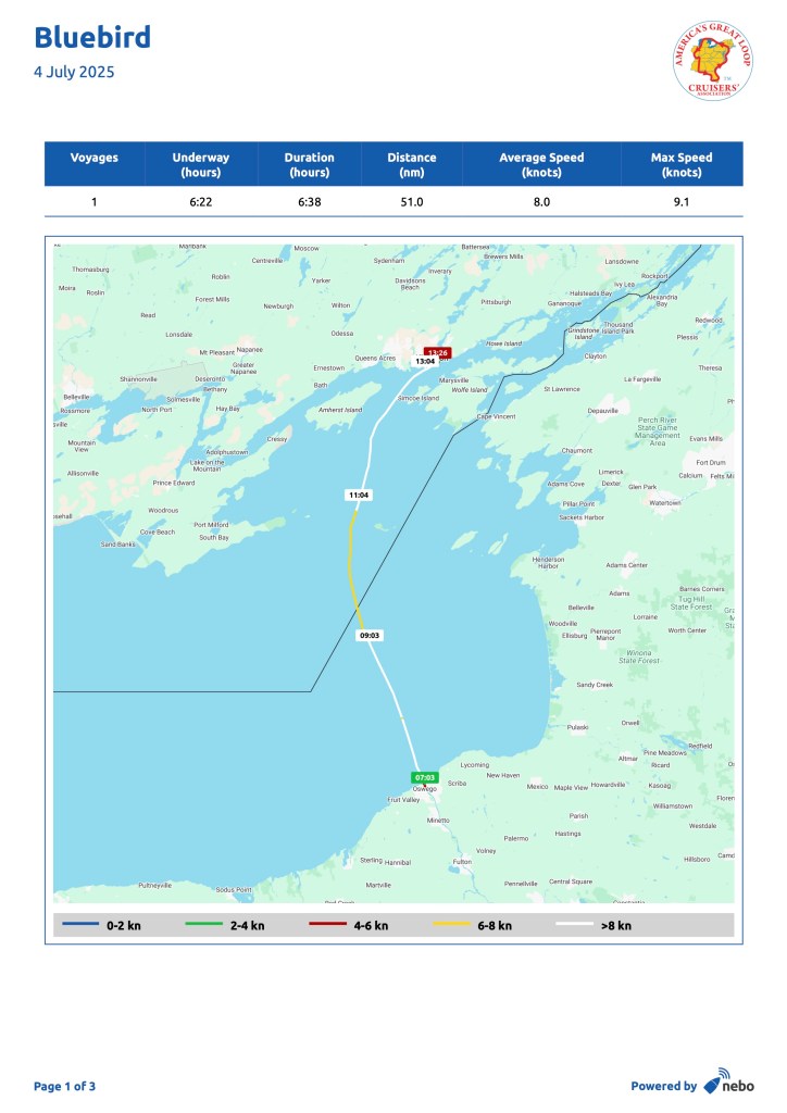 We were up early the next morning, July 4, for our long stretch across Lake Ontario! Seas were forecasted to be 1 to 2 feet, although it seemed a little more than that to start…