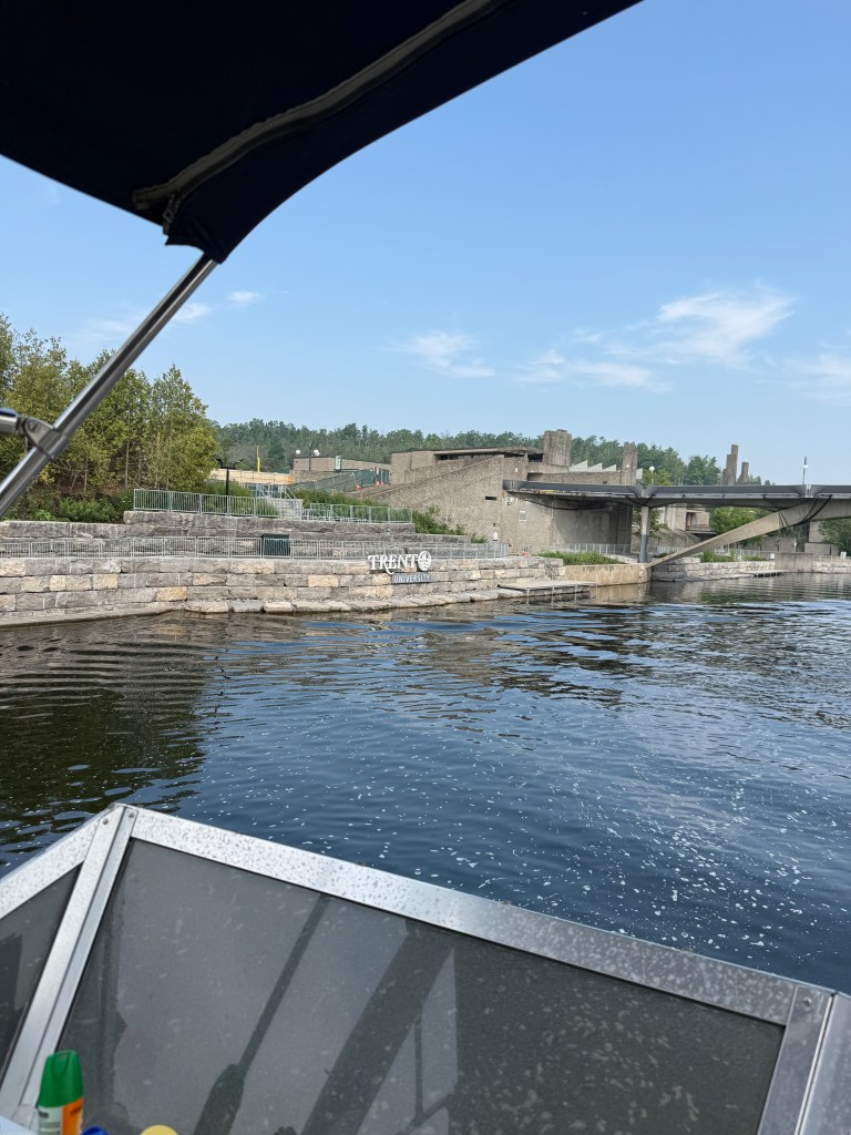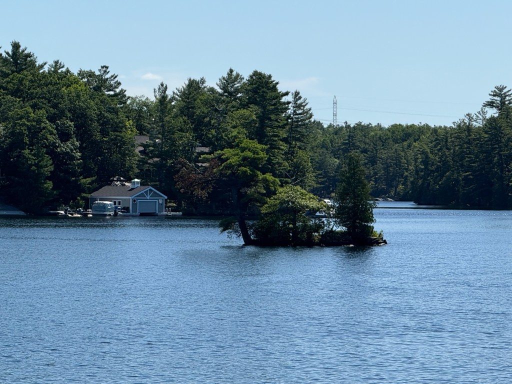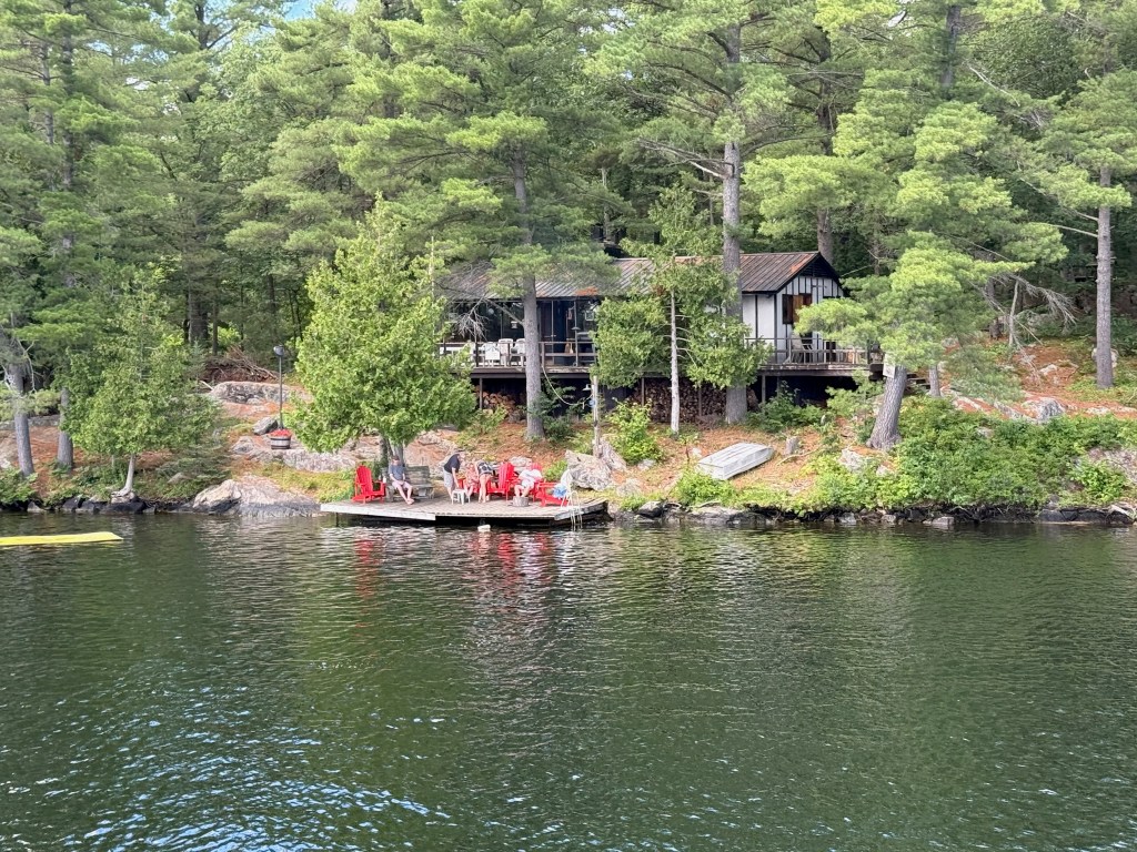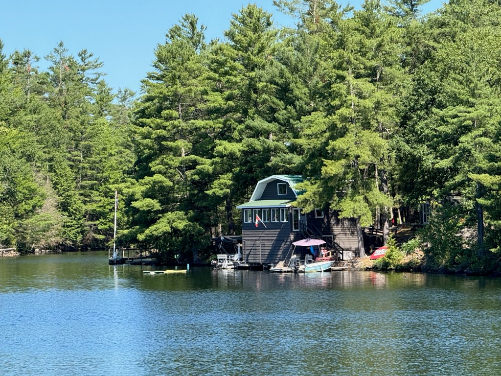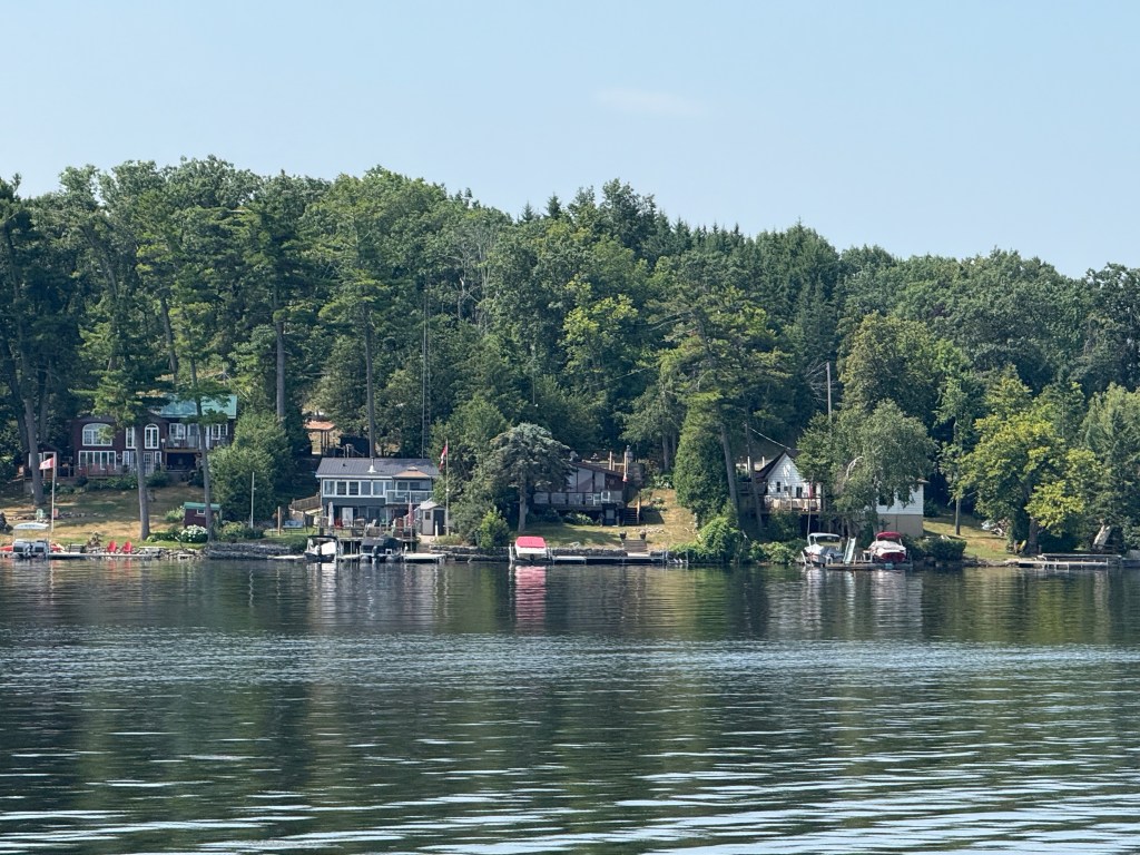 The landscape changed subtly as the rocks and trees dominated and the fertile farmland faded into memory. We passed by Trent University and their interesting architecture. There seemed to be a thin skim of pine needles and moss over the rocks up here in the Canadian Shield and hitting a rock with our propellers became a real possibility — and a source of terrible anxiety for the captain. The cottages and cabins ranged from shacks that you don’t think could make it through a Canadian winter to large suburban-type homes that appeared in clusters in certain communities. Everyone had a dock and several boats (power and otherwise) and there were many cabins all alone on islands.