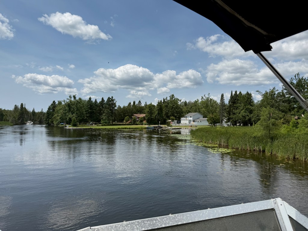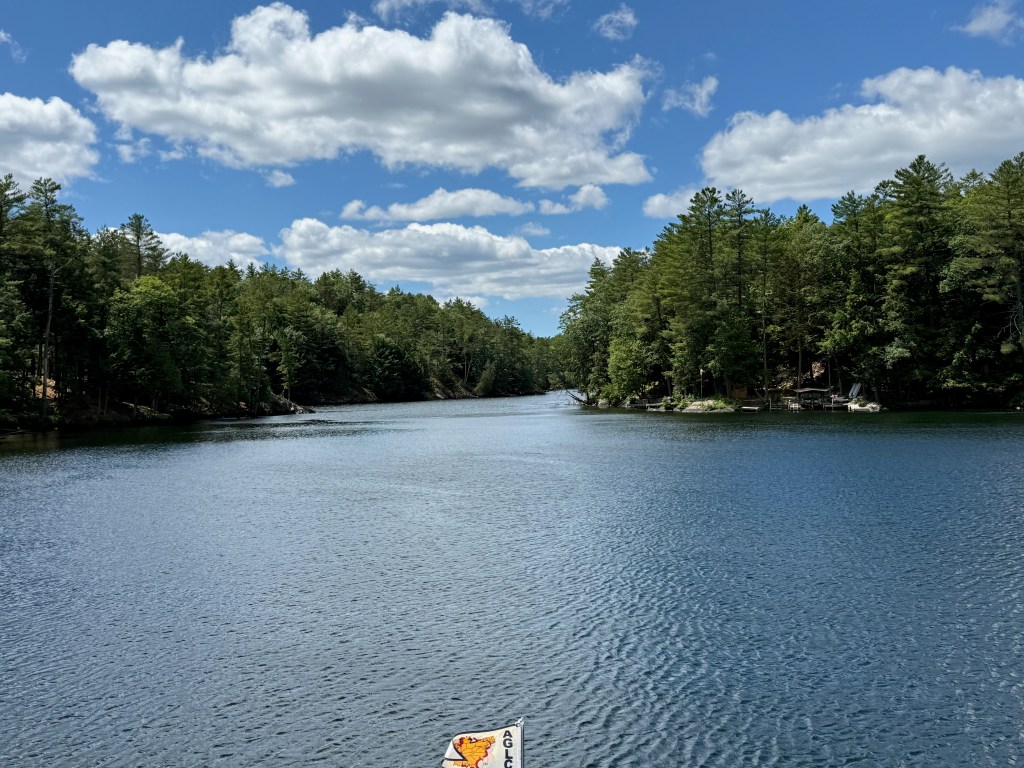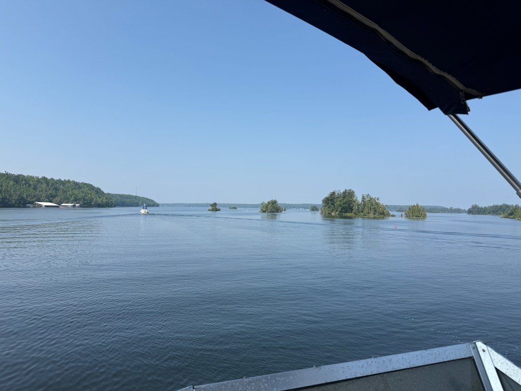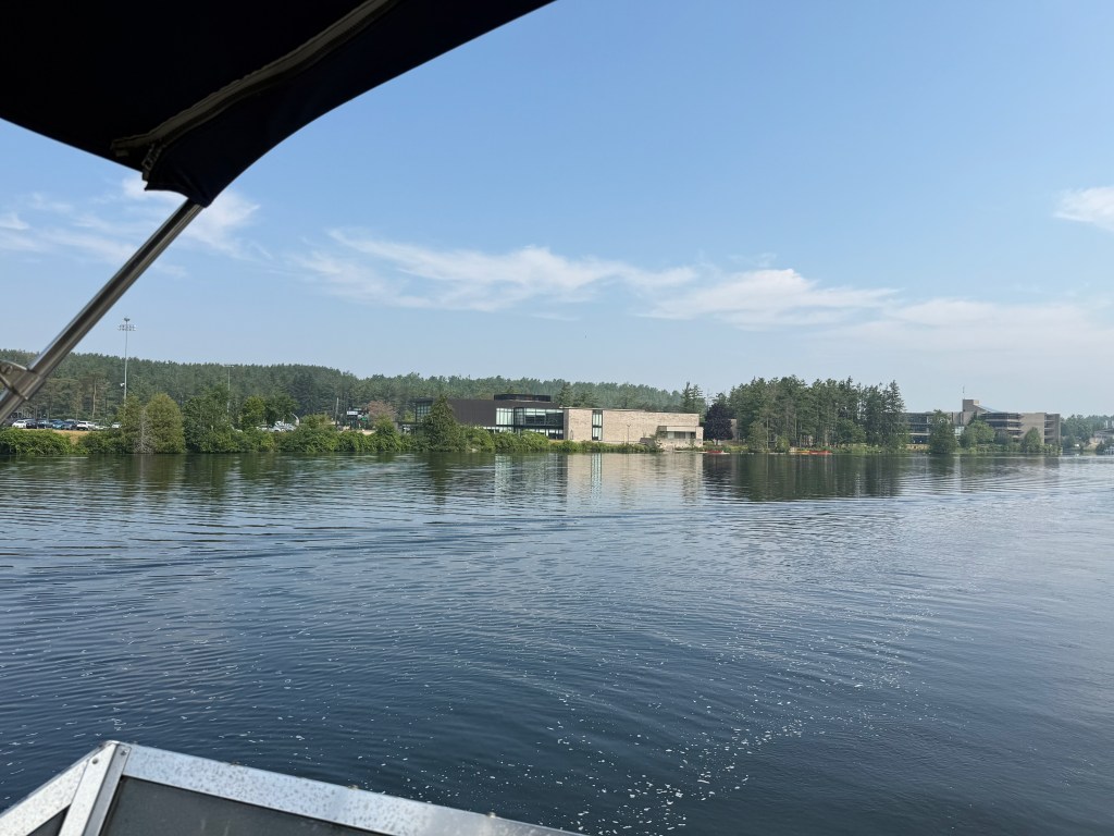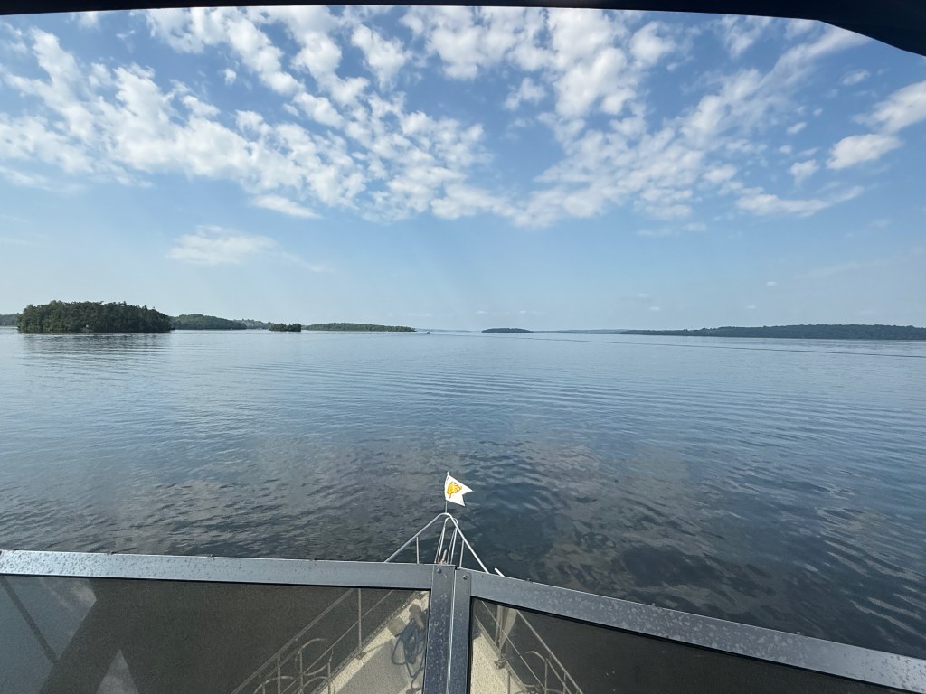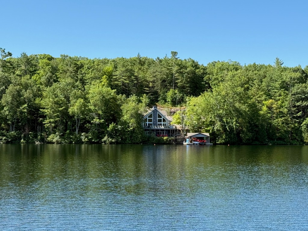 The landscape changed subtly as the rocks and trees dominated and the fertile farmland faded into memory. We passed by Trent University and their interesting architecture. There seemed to be a thin skim of pine needles and moss over the rocks up here in the Canadian Shield and hitting a rock with our propellers became a real possibility — and a source of terrible anxiety for the captain. The cottages and cabins ranged from shacks that you don’t think could make it through a Canadian winter to large suburban-type homes that appeared in clusters in certain communities. Everyone had a dock and several boats (power and otherwise) and there were many cabins all alone on islands.