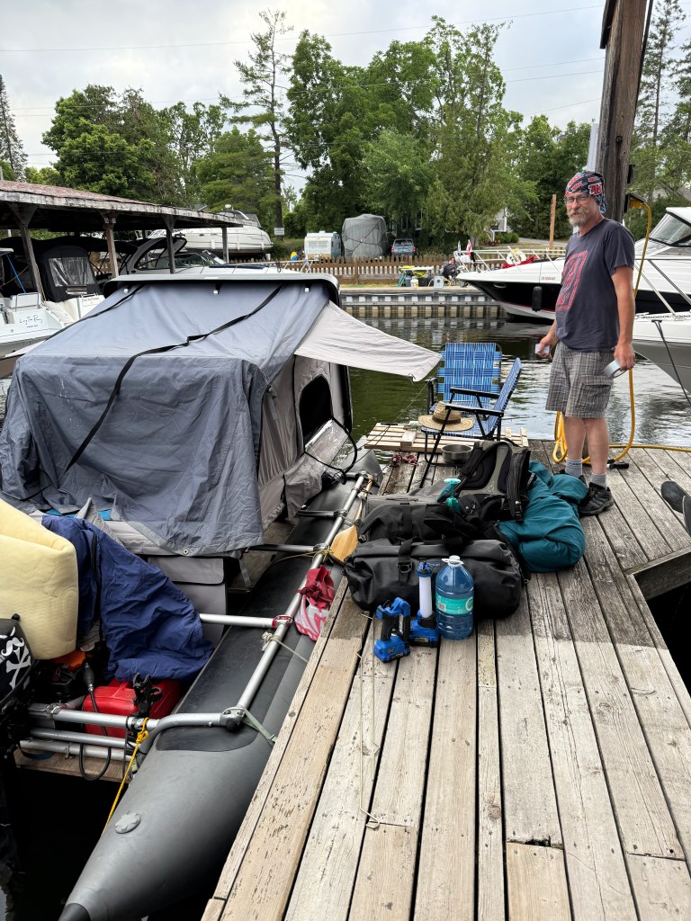 Hervey met a guy from Toronto who was preparing to run a northern river to the Arctic Ocean in this homebuilt rig. Oliver Solaro (https://northernontario.travel/author/oliver-solaro) is an adventurer on a spectrum much further out than people like the two of us. He showed me his simple rig and told me about his previous trips.
