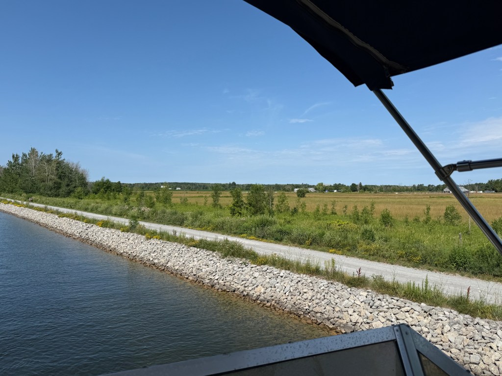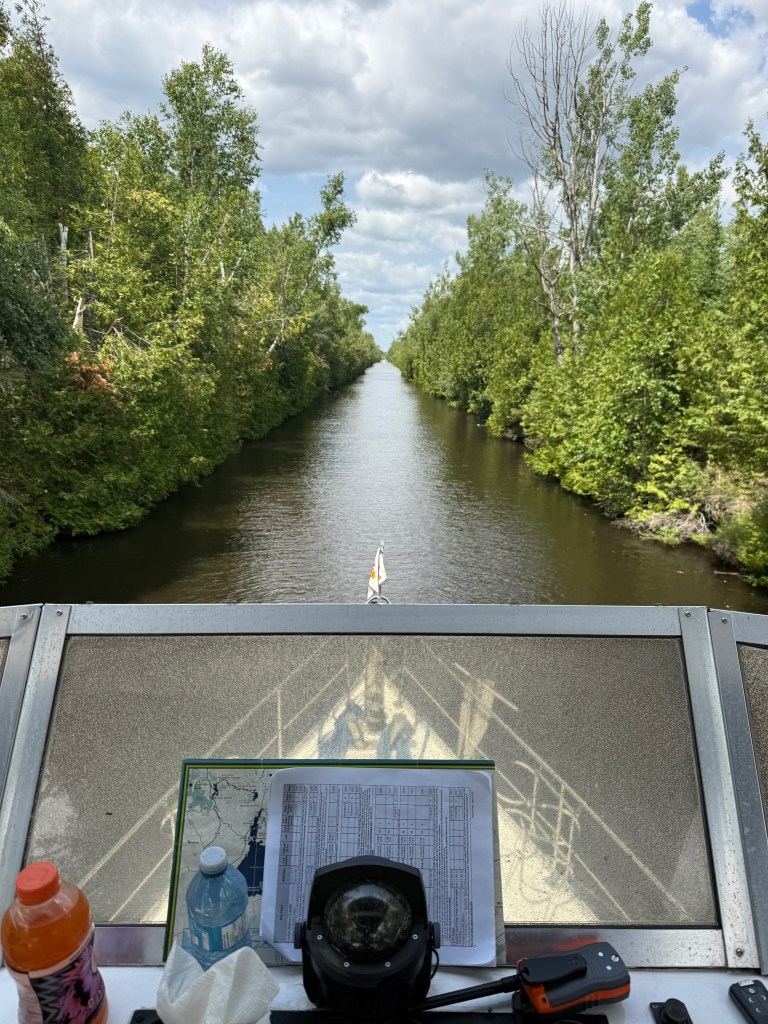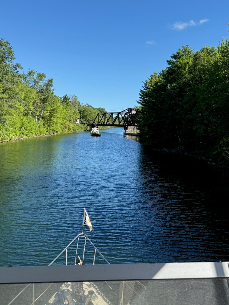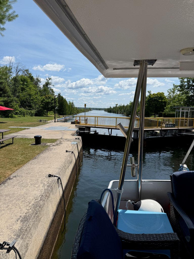 There were only four locks today, as we reached our highest point on the Loop: 850 feet above sea level! From here, it is all downhill to the Gulf of Mexico! The land changed again as we came back into more agricultural land. But the cottage culture still dominated in places and the cabins on Balsam lake in particular were extraordinary. The Kirkfield lock was a smaller version of the Peterborough hydraulic lock, but because it was descending for us, it had an excitement all its own. The Trent-Severn Waterway narrowed here to a dug canal. It was very narrow and had some tricky turns at places. At one point, Hervey had to broadcast a “Securite” call to announce that we were a large vessel coming through and others should hold back until we were in sight.