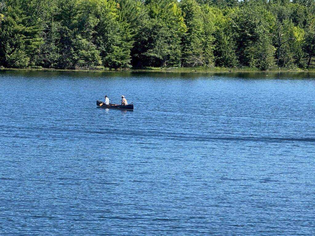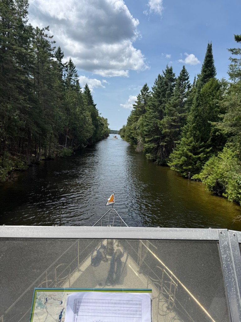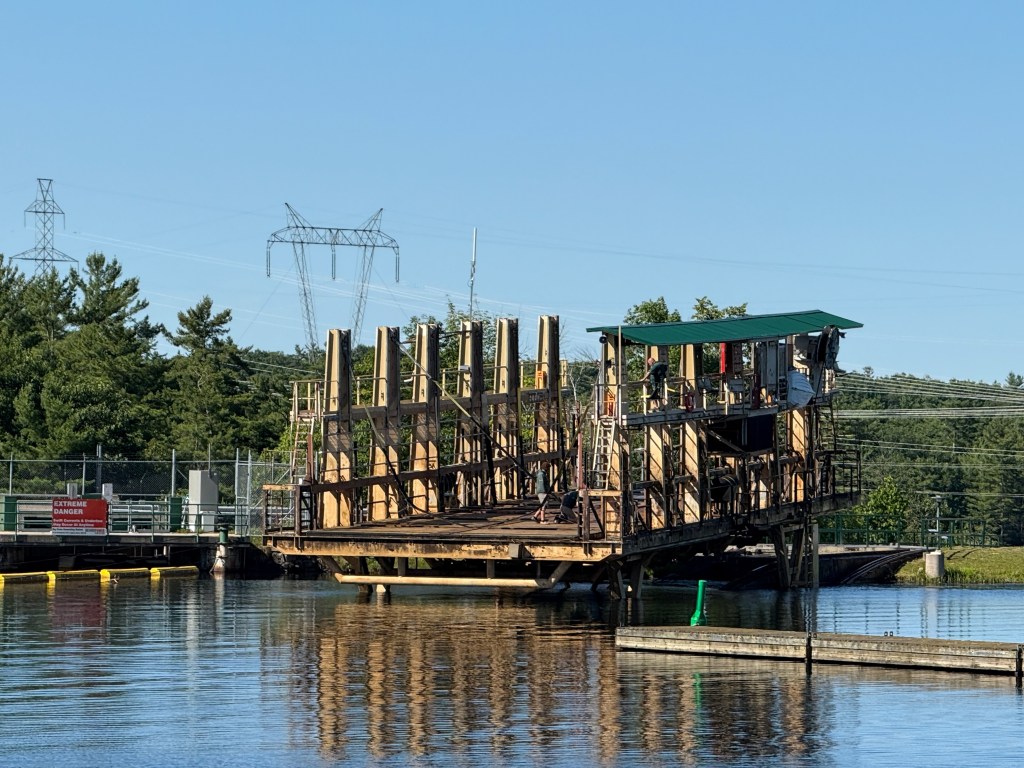 We stayed in Orillia on Sunday and left the next morning for two more locks. We were delayed at a Canadian Railways Bridge for a couple of hours, but soon continued on and made our way through Couchiching Lock and Swift Rapids lock and approached the Big Chute Marine Railway. As we transited Sparrow Lake (beautiful! and full of cabins and fish and canoeists), Hervey’s head filled with dreams of returning here to hang out and fish hard for a week or so. We soon arrived at the Big Chute and checked into a marina just at the head of the lock. The “lock” is actually a railway that carries boats across from one lake to the next and had been out of commission for a couple of days before we arrived. As we settled into the marina and walked the dog, we watched the lock start up again and transit all the waiting boats to the other side, 58 feet down. We are six miles from the end of our journey, and our final lock, on the Trent-Severn Waterway.