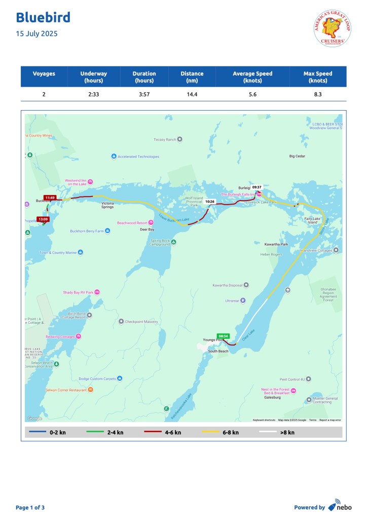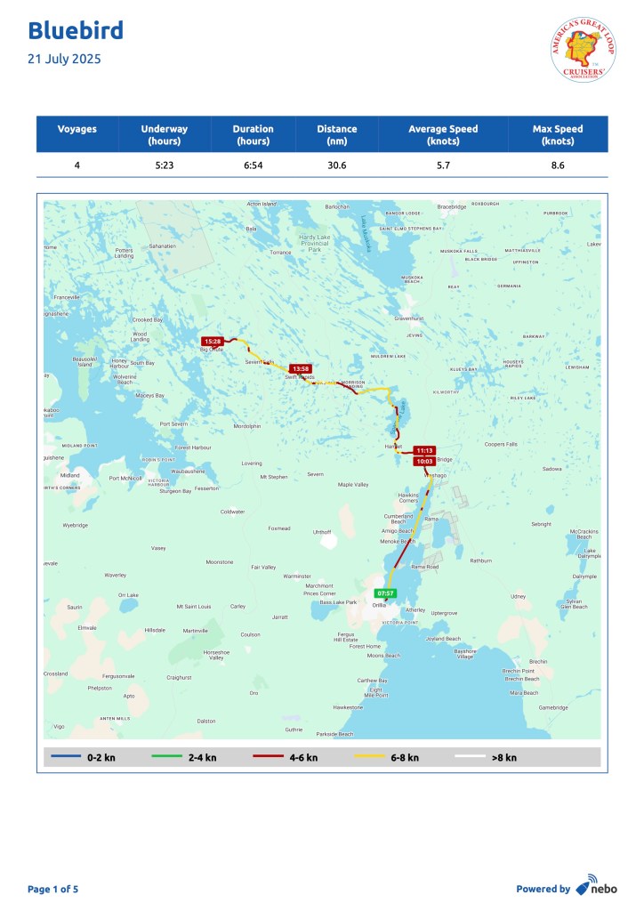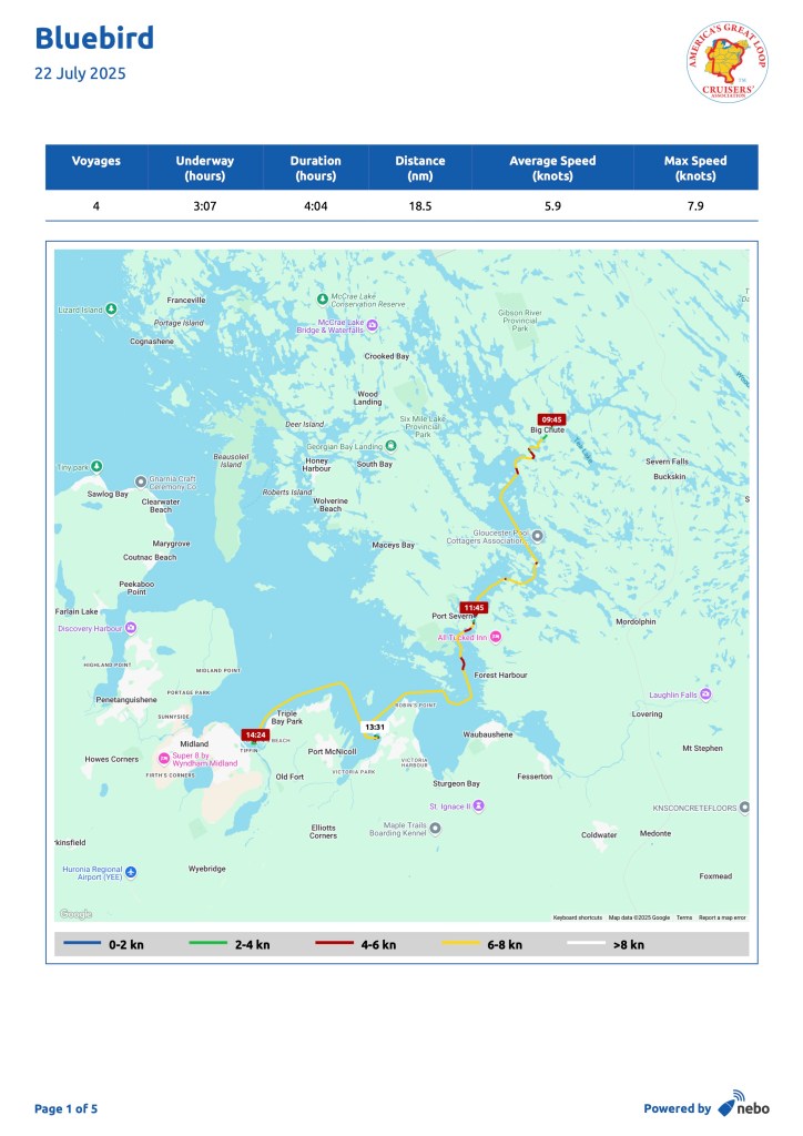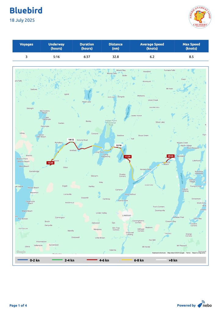 A personal note: one of our fellow loopers, Egbert Dees from Virginia, onboard his very handsome homebuilt boat “Pur Dee”, was found dead near Clayton, NY on July 20 or 21. We met him in Oswego, NY and had a long conversation with him. The cause of death is unknown: https://www.nny360.com/top_stories/virginia-man-found-dead-in-st-lawrence-river-was-on-a-6-000-mile-journey/article_d64d0eef-9f3a-599e-a19d-88a0ce588bc9.html