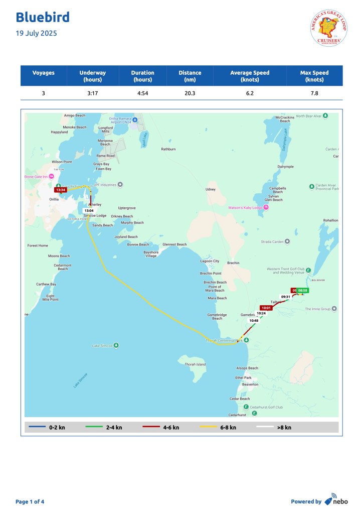 July 19 was our last day before Lake Simcoe and the town of Orillia where we would take another break. This is the home territory of Gordon Lightfoot and we played his music often as we approached his home territory. There were five locks today, but that left only four more for the entire Trent-Severn Waterway. We pushed through and crossed Lake Simcoe (14 miles) to get to our port for a couple of nights in the early afternoon.