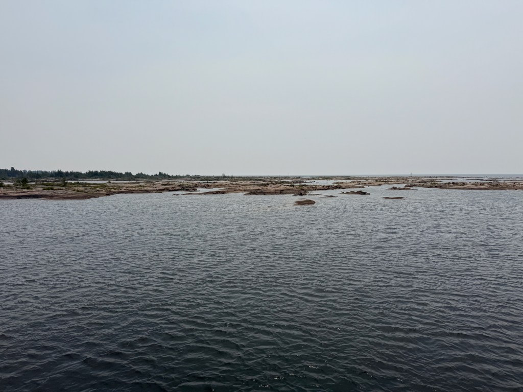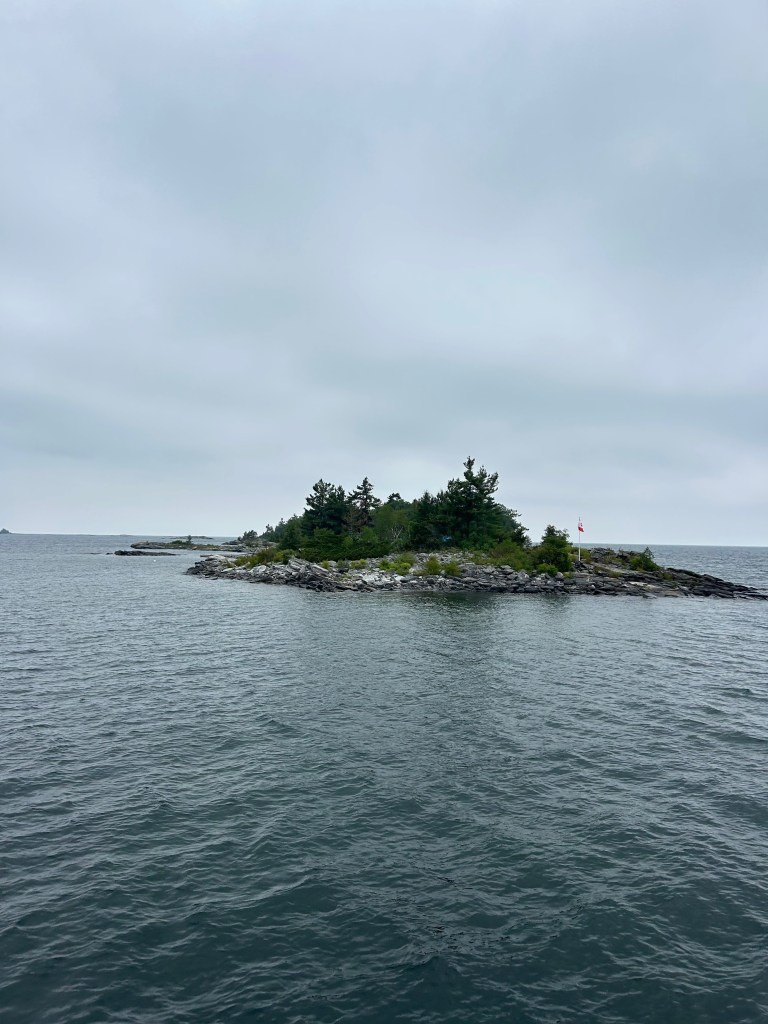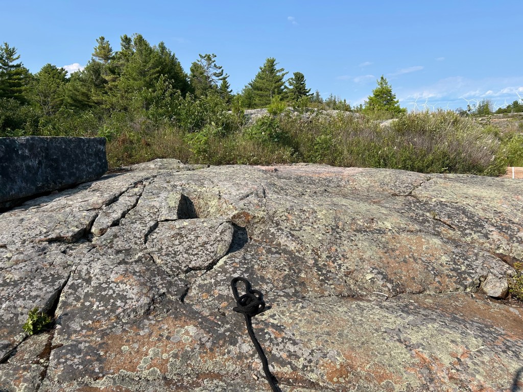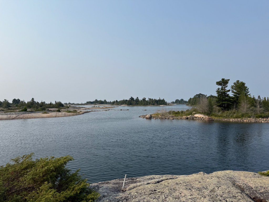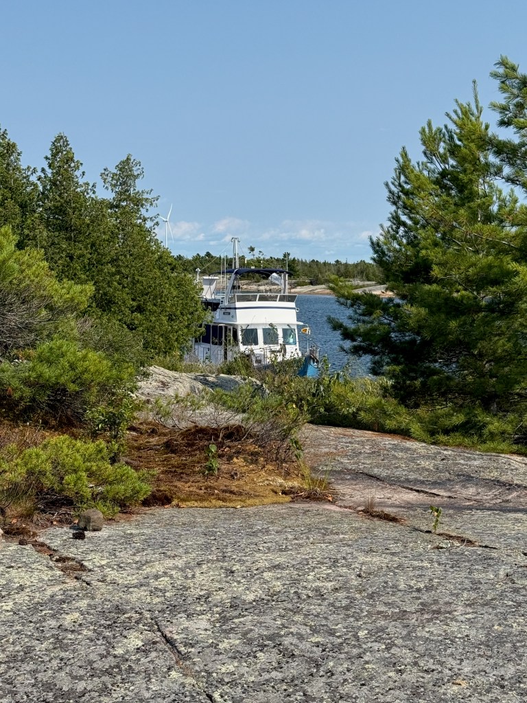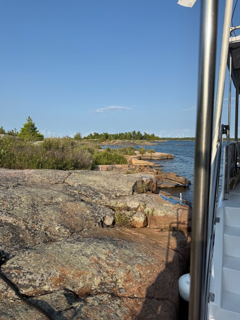 So here we are. Tied to a rock at N 45° 50.354′ / W 080° 44.581′ (just north of the latitude of St. Paul, MN and about 10 degrees (about 600 miles) east of there. The land feels familiar to us from our Boundary Waters trips in Northern Minnesota. The area feels very far north; flat and sere, with pockets of greenery and wilderness all around us. There is a cabin on an island about a mile from us, and windmills galore on the eastern shore, but no other evidence of humanity.