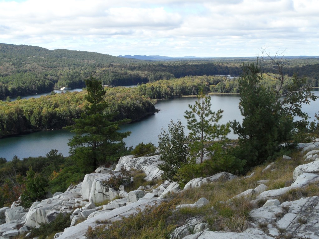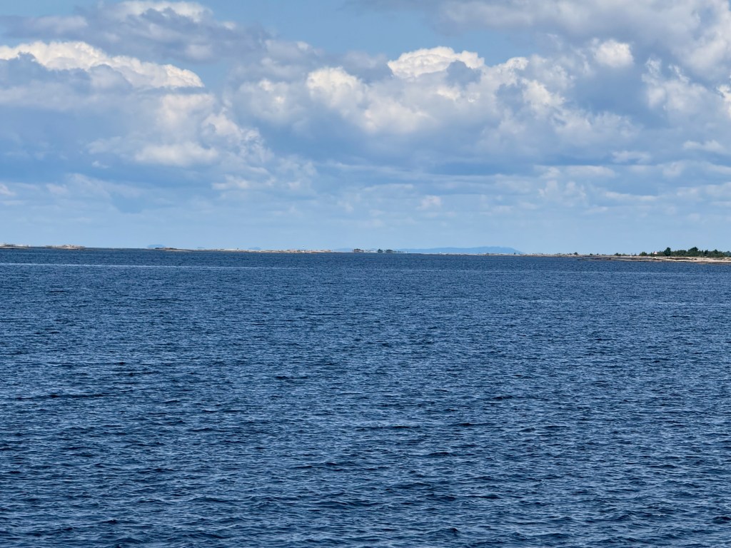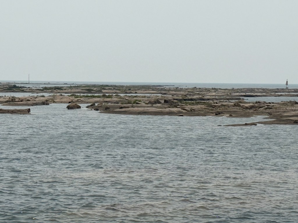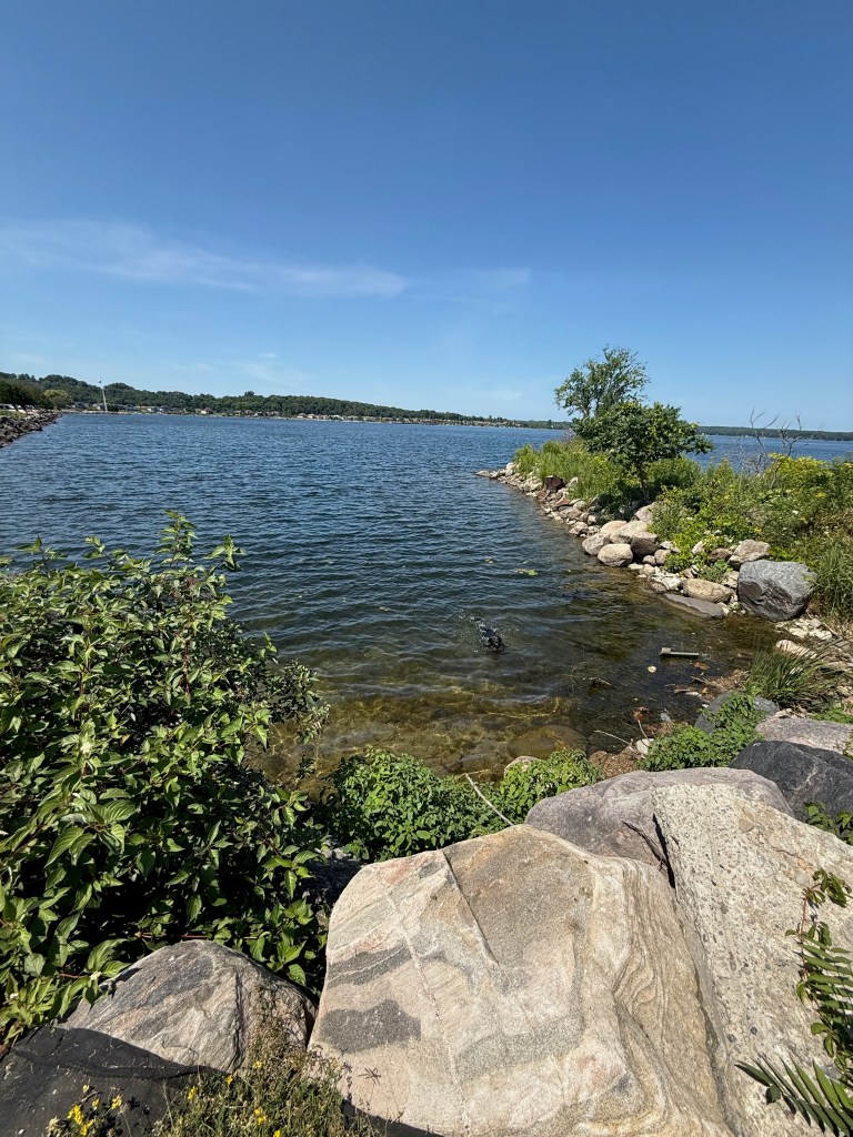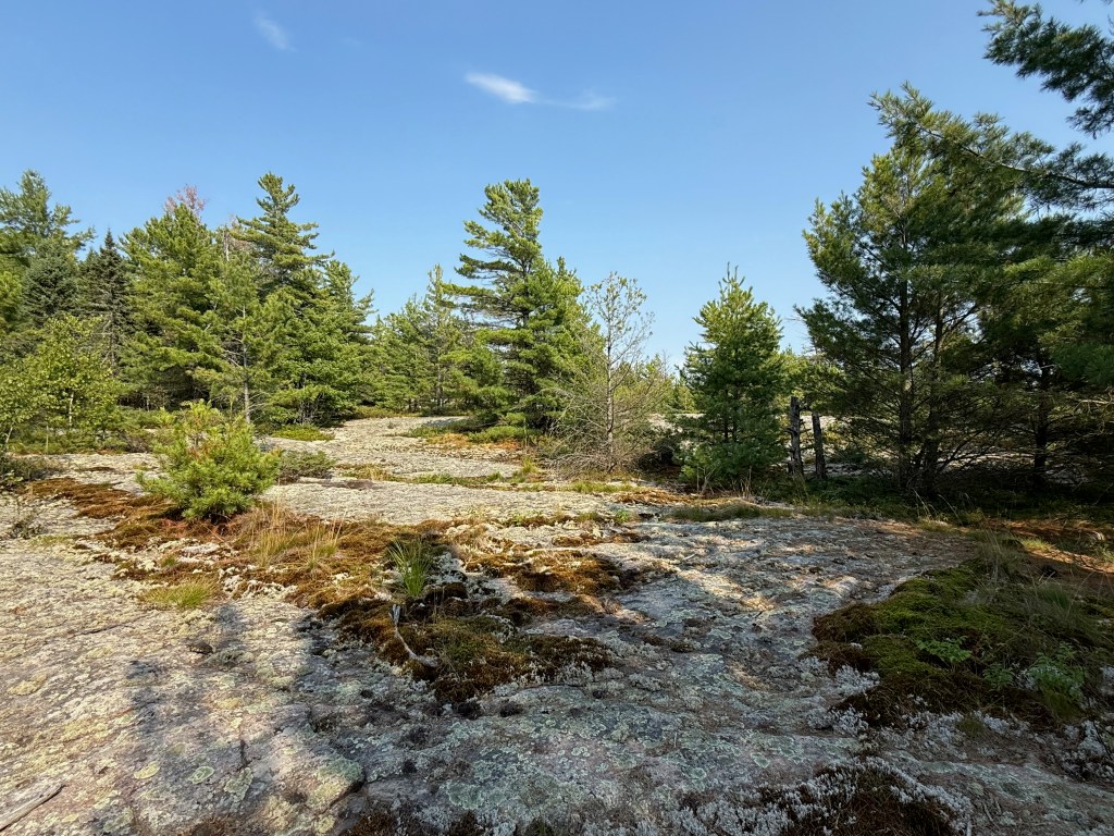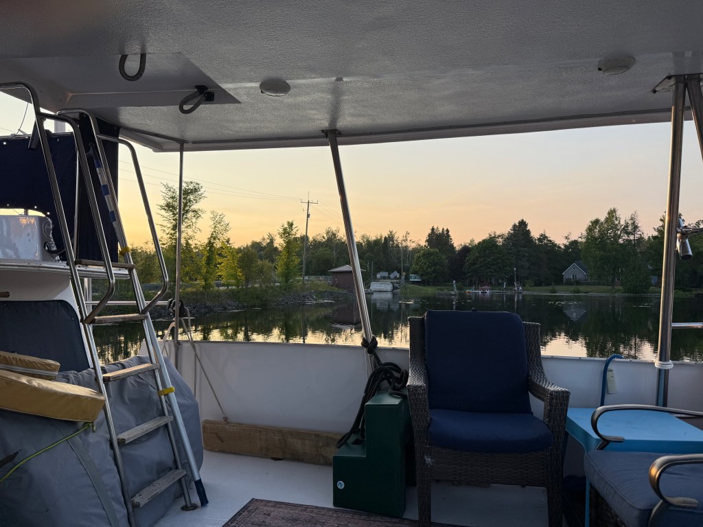 So here we are. Tied to a rock at N 45° 50.354′ / W 080° 44.581′ (just north of the latitude of St. Paul, MN and about 10 degrees (about 600 miles) east of there. The land feels familiar to us from our Boundary Waters trips in Northern Minnesota. The area feels very far north; flat and sere, with pockets of greenery and wilderness all around us. There is a cabin on an island about a mile from us, and windmills galore on the eastern shore, but no other evidence of humanity.