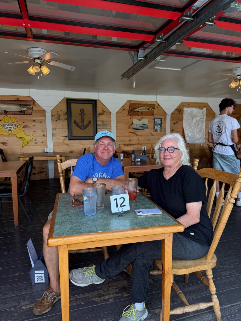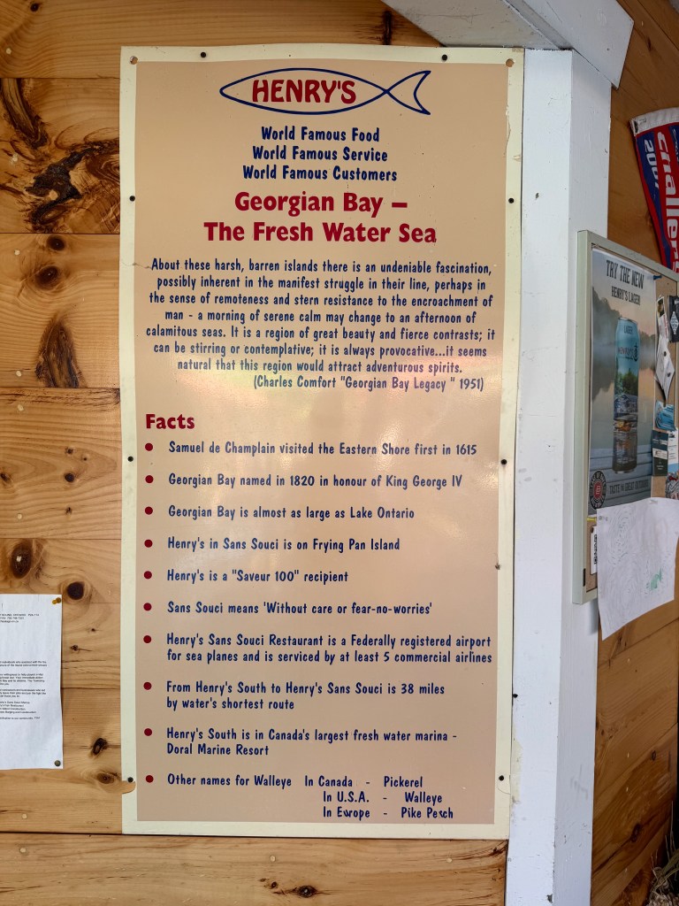 Arriving at Henry’s Fish and Chips was easy and, thanks to our early start, we were able to have lunch AND dinner there. The walleye was fresh and delicious! Boats and sea planes were coming and going all day and the ice cream was a great finale to the day. We had dinner with fellow boaters, Chris and Judy Guard aboard “Ohm Sweet Ohm”, a Greenline GL 40 hybrid boat driven by electric motors and powered by batteries that were fed by solar panels and a Volvo diesel generator.