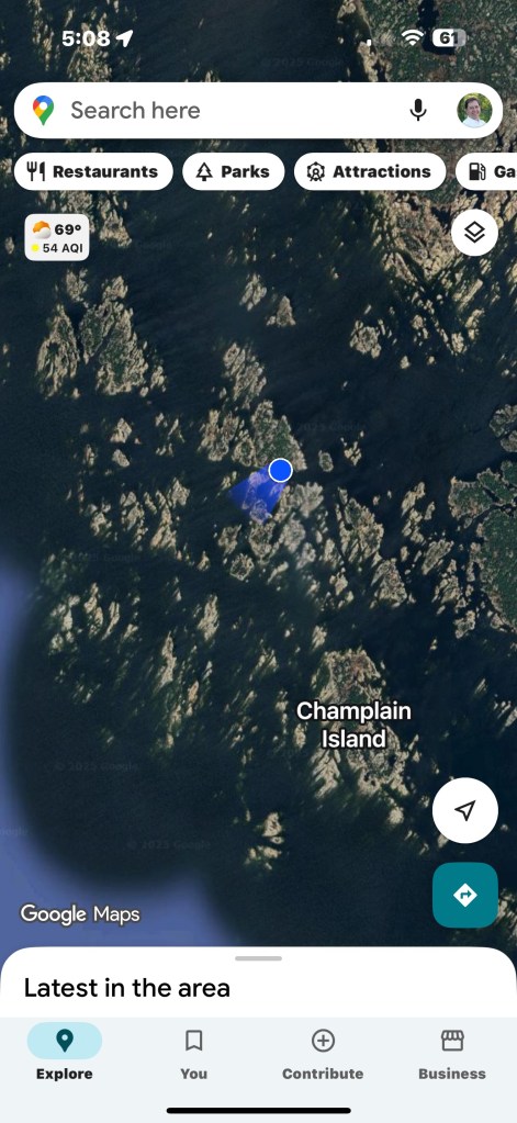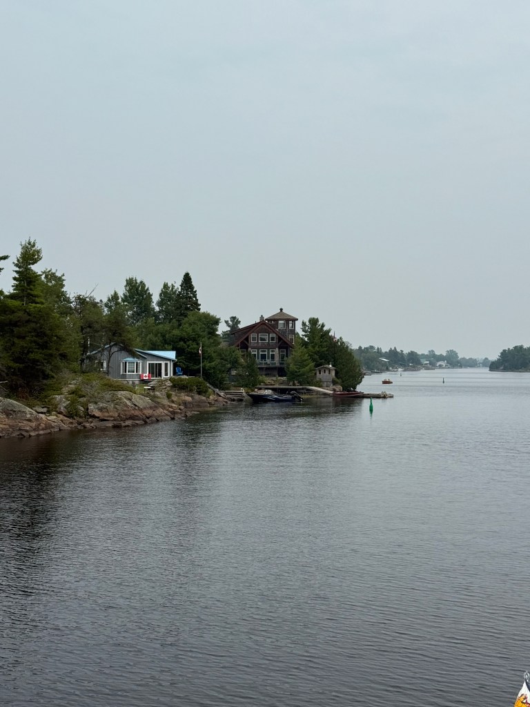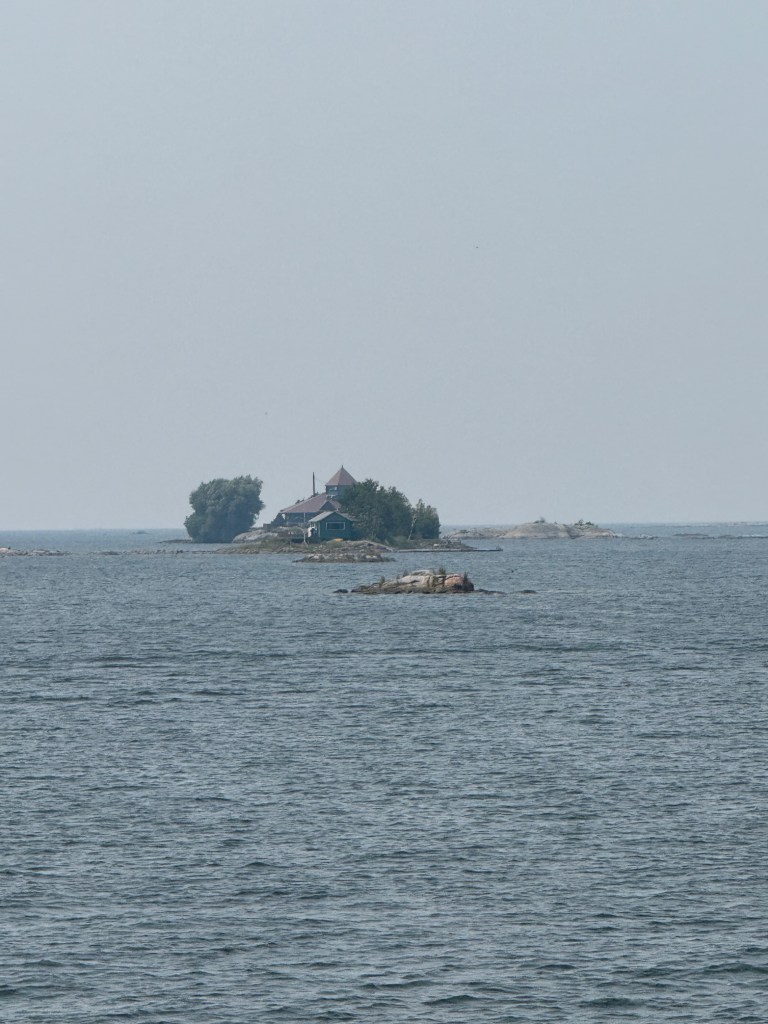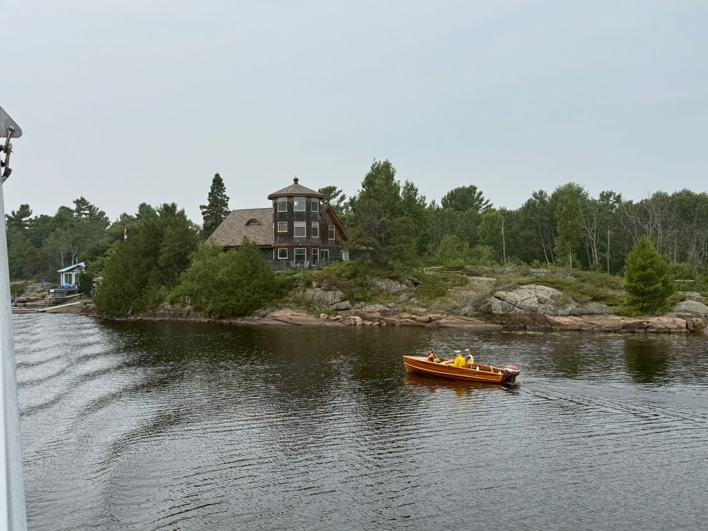 Making our way north to Sans Souci Island and Henry’s Fish and Chips, we took the “small boat channel” which is well marked on the maps, on the chart plotters, and with bouys and markers in the water. Nonetheless, it required close attention to avoid the rocks and shelves all around the passage. The marinas were full of stories and examples of boats who had lost propellers or otherwise run afoul of the unforgiving rocks of Georgian Bay. Skirting the big water as we did, we were lucky to have had calm weather and a mostly clear sky. The haze from the fires in Western Canada dominated the sky and the evening stars were mostly obscured.