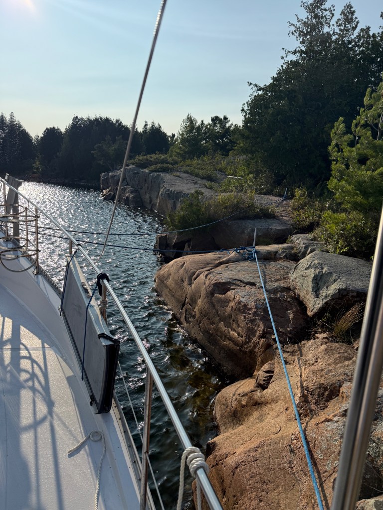 We chose to go to Rogers Island, a recognized anchorage that also had a rock mooring with enough draft for our boat (4.5 feet) and steel stakes in the rock to tie to. It was not a long trip, but we were headed into the unknown (again!) and were planning a week of this before we got to Killarney. We were nervous about our windlass and our anchoring skills are not well-developed. We were towing the dinghy for the first time and made our way gingerly to the mooring. All of a sudden, we heard a noise from the stern and Hervey shut down the starboard engine immediately: we had picked up the towing rope from the dinghy in our starboard prop!