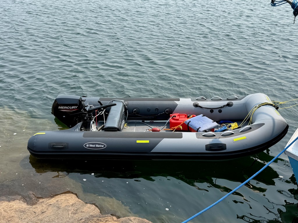 We stayed two days at the Wye Heritage Marina in Midland. We took the opportunity to erect the tower on our bridge for the stabilizers and to inflate the dinghy that had been on our aft deck for the past 2,000 miles. Our dinghy motor, a 9.9 hp MerCruiser outboard, turned out to be toast so we replaced it with a 20 hp MerCruiser. It’s like having a sports car attached to our fleet. We decided to name the dinghy “Mockingbird” in recognition of its colors.