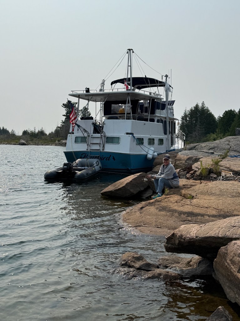 It was a 50 mile run to Byng Inlet and the little town of Britt, Ontario. The day started at 8:00 am and we ran until about 3:00 pm, going carefully through these narrow and winding passages. We had left “cottage country” behind: these homes were real outposts of civilization and would be subject to intense weather and cold for at least six months, from November through April. Wright’s Marina was a very comfortable stay for a couple of days and we used the dinghy to run to the grocery store for some things we had forgotten. We also rigged the dinghy for towing. Hervey had a fascinating conversation with the former head trade negotiator for Canada who was on his way to his island home from Ottawa. We did some planning and expected to spend the next week off the grid.