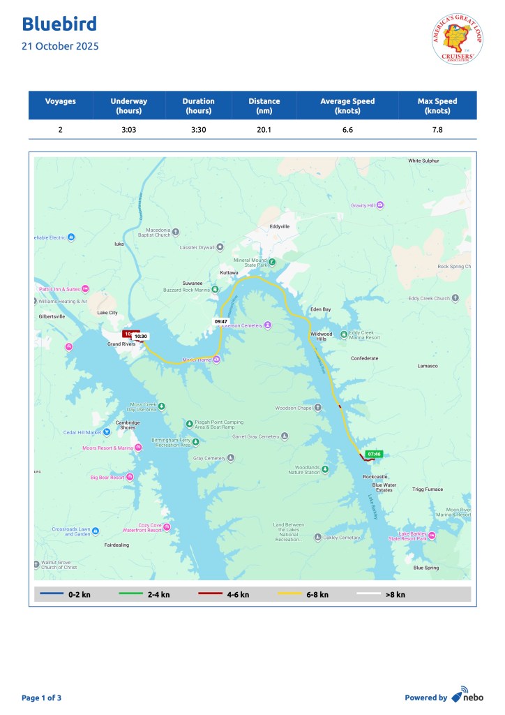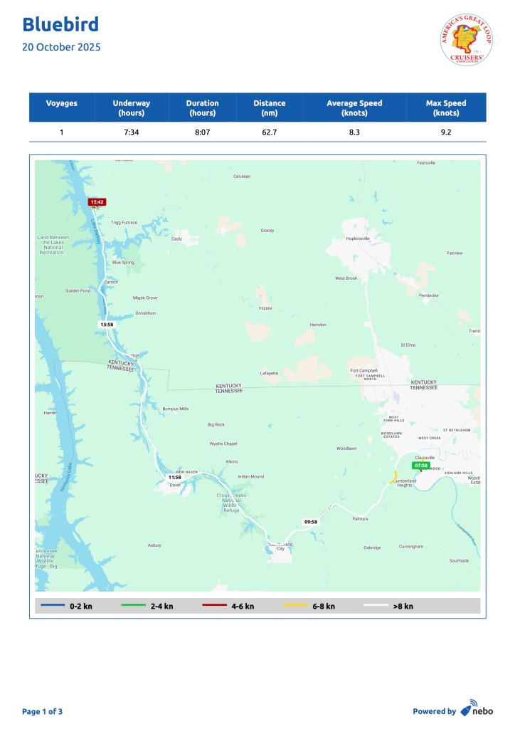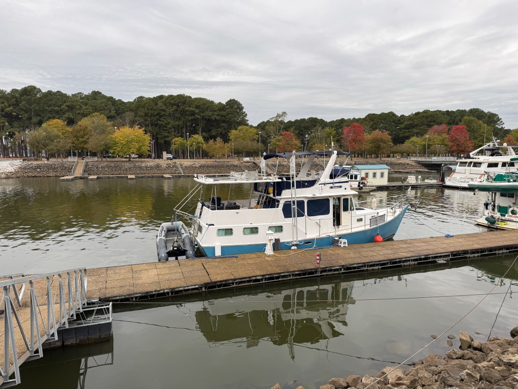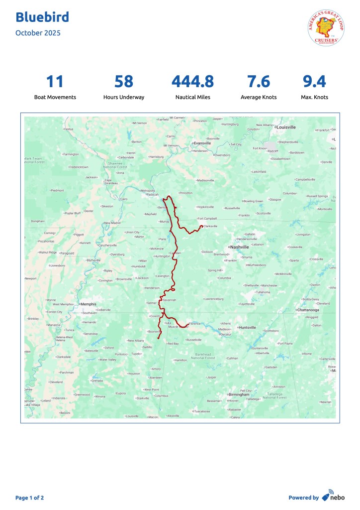 We returned to Bluebird at Green Turtle Bay Resort and Marina in Kentucky after almost three weeks away. We had a sibling trip with Hervey’s sisters and their husbands in North Carolina (an annual event since 2002, made all the more poignant with the 100th anniversary of his father’s birthday.) We also had medical appointments and an opportunity to spend time with friends and family in Baltimore. We were gone from September 29 to October 16. While we were gone, the mechanics at the marina fixed the captains chair solidly to the bridge deck, fixed the windlass, and replaced the starter and impeller in the generator. With all systems ready to go, we left the next day for Nashville, via Clarksville, Tennessee. We were searching for the music of a generation…