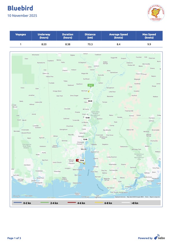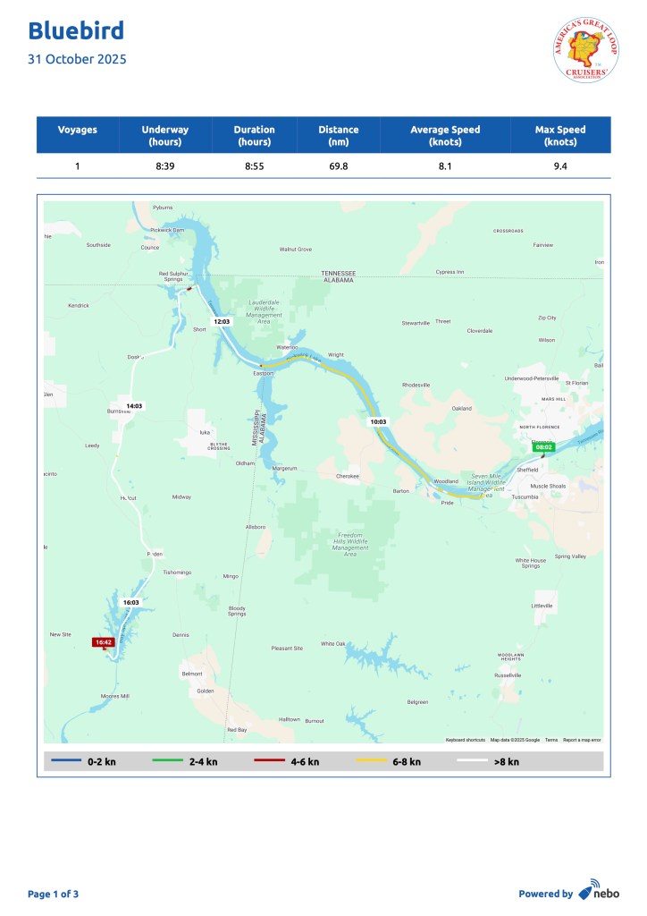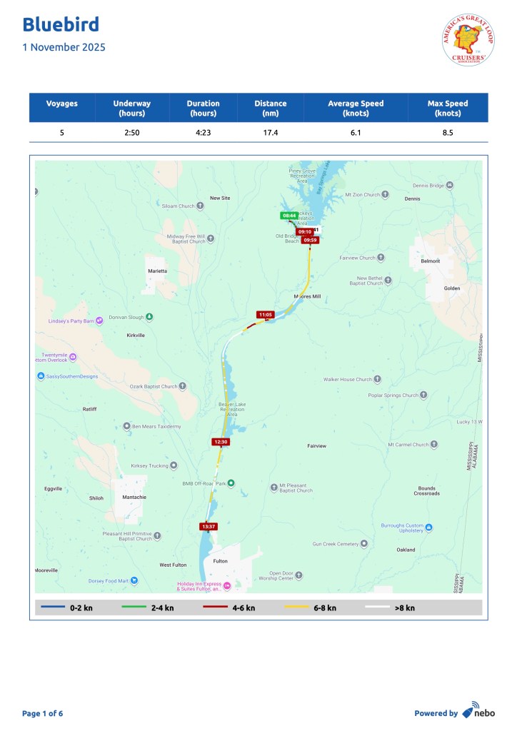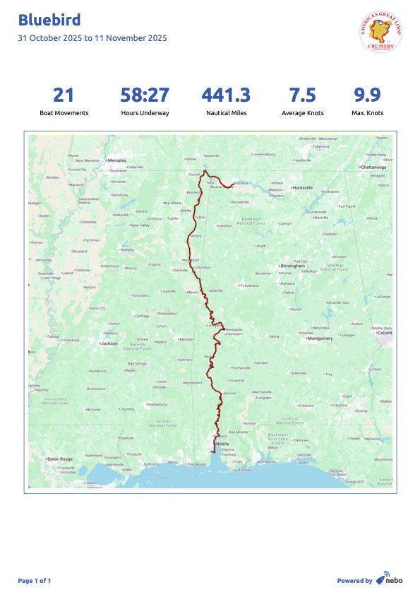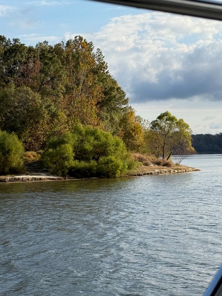 We left Florence, Alabama and the hill country on October 31, Halloween, 2025, and re-crossed Pickwick Lake on the Tennessee River to the entrance to the Tombigbee Waterway https://en.wikipedia.org/wiki/Tennessee–Tombigbee_Waterway near the intersection of Tennessee, Alabama, and Mississippi on our way to Bay Springs Marina, just before the first Jamie Whitten Lock.