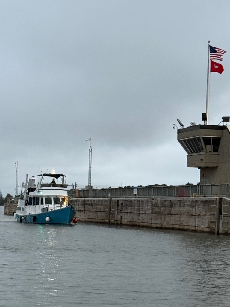 A small blue boat appeared just as we were entering the first lock and became part of the flotilla. He was a Canadian who was making his way to Florida in this small and slow converted sail boat with a 2 hp motor. He tied up with another boat in the lock chamber but was soon left fair behind as we speedier boats (6 knots!) made out way to the next one. We waited but he did not appear, so we all proceeded without him. Later, we learned that he had stopped and anchored out for a time, but kept going steadily until he showed up with us again many miles later. Truly a tortoise and the hare story!