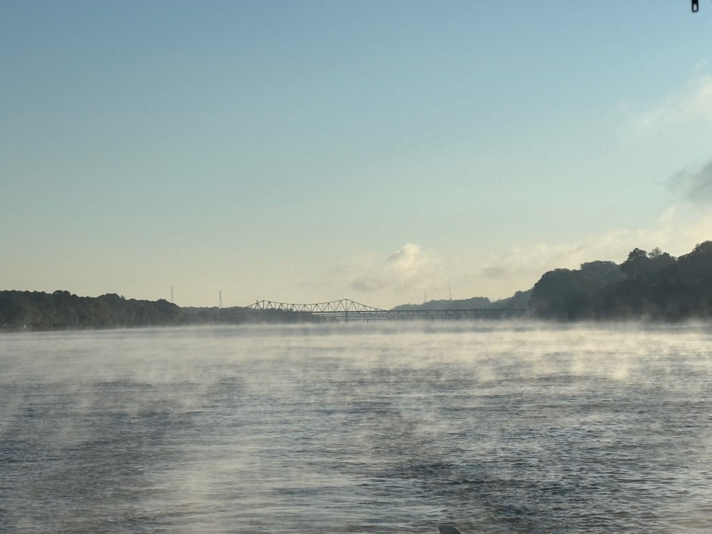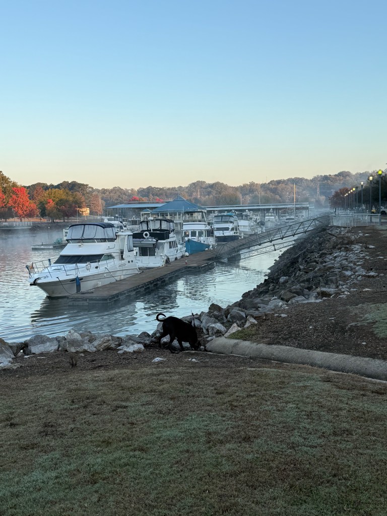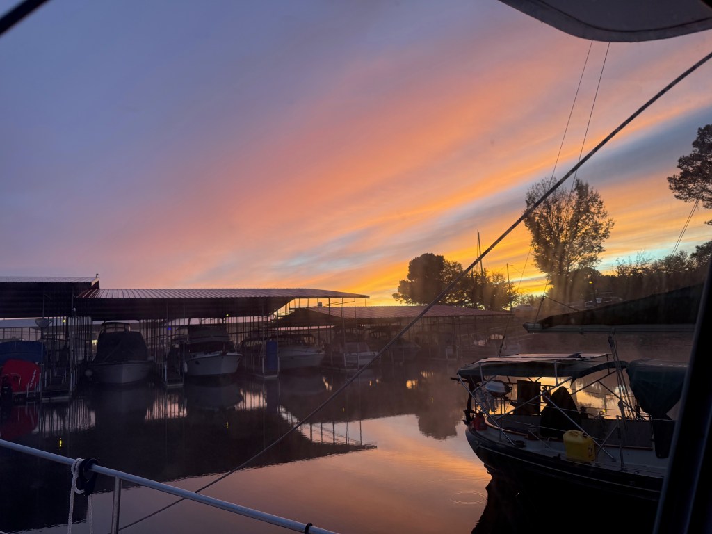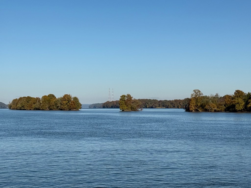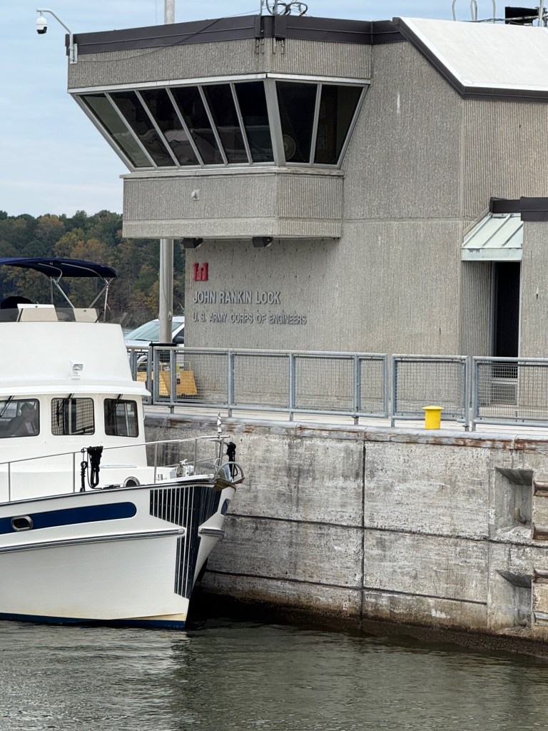 We left early, as is our custom, after walking the dog, performing engine checks, and grabbing a first cup of coffee. Breakfast is often leftovers from dinner with an egg on top and we munched happily as we retraced our path back down the Tennessee River towards the Pickwick Lock and Dam. Many of our looper friends had continued on past Florence to Chattanooga and even Knoxville, Tennessee, but we chose to keep that pleasure for another trip from St. Petersburg where we can savor the journey and not feel rushed. The lake was easy but we had to stay in the channel on this TVA- made lake. Power lines crossed the lakes and rivers regularly, taking hydroelectric power from the dams to power New Orleans and the factories and other cities of the South.