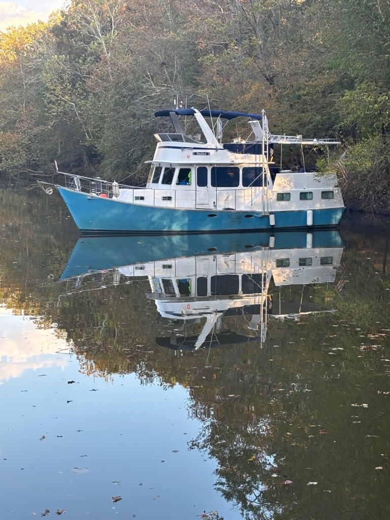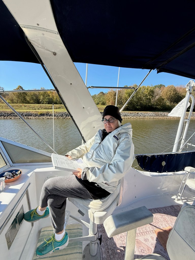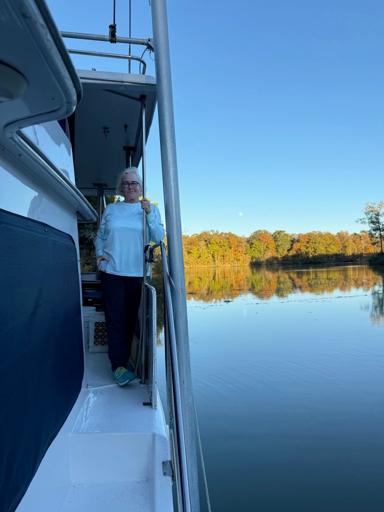 Turning south at the entrance of the Tombigbee Waterway was a transition for us: Mobile beckoned as did the warmer weather of the Gulf and the end of our loop journey in St Petersburg. Fall was in the air and the chill in the air brought out our winter gear. Hervey pilots from the bridge on the topmost part of the boat and is exposed to the weather, sheltered only by the canvas bimini and the small wind screen (dodger) in front of the now-repaired captains chair. The Tombigbee Waterway was the last link in the current loop path to be opened, in 1984 under Jimmy Carter’s administration, and we could sense the newness of it in the condition of the waterway and the newness and paucity of the riverside services. The locks were straightforward ties to floating bollards amidships that were easy to navigate and we encountered few delays as we traveled downstream, unfortunately with little current to assist us.