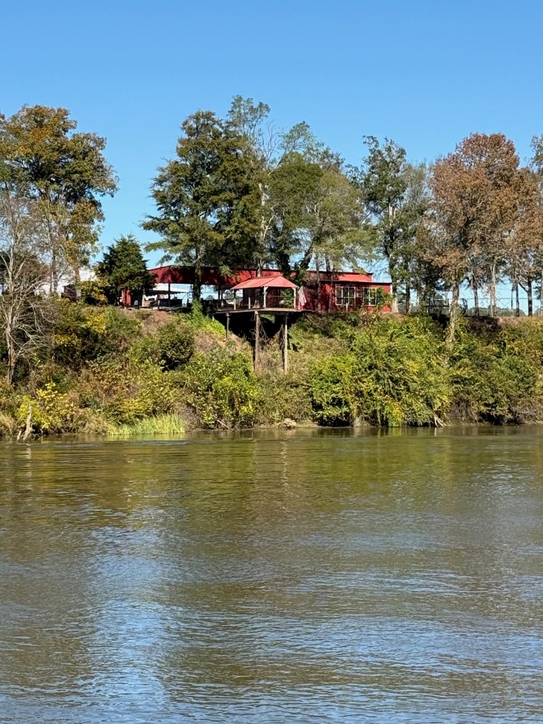 And the river changed again. The locks were the same on the second day: a long one. The shore became less of a canal and more of a river as we made our way to Columbus. MS. We had continued to look for music venues along the way but they eluded us.