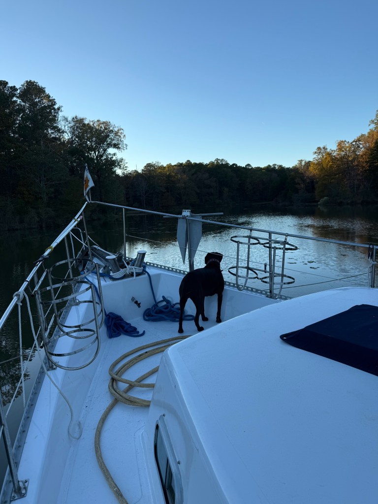 Our first night, we anchored out up a little river with some other boats. We were the last boat upstream and found ourselves in the trees and close to the bank. Hervey took the dinghy to shore to let Duke have a run but kept a close eye on him for the evening. The next morning, after all the other boats had left, he took him to a large open field near a boat ramp where the risk of being eaten was somewhat lessened.(!) We were cleaning leaves off the boat for days after that adventure.