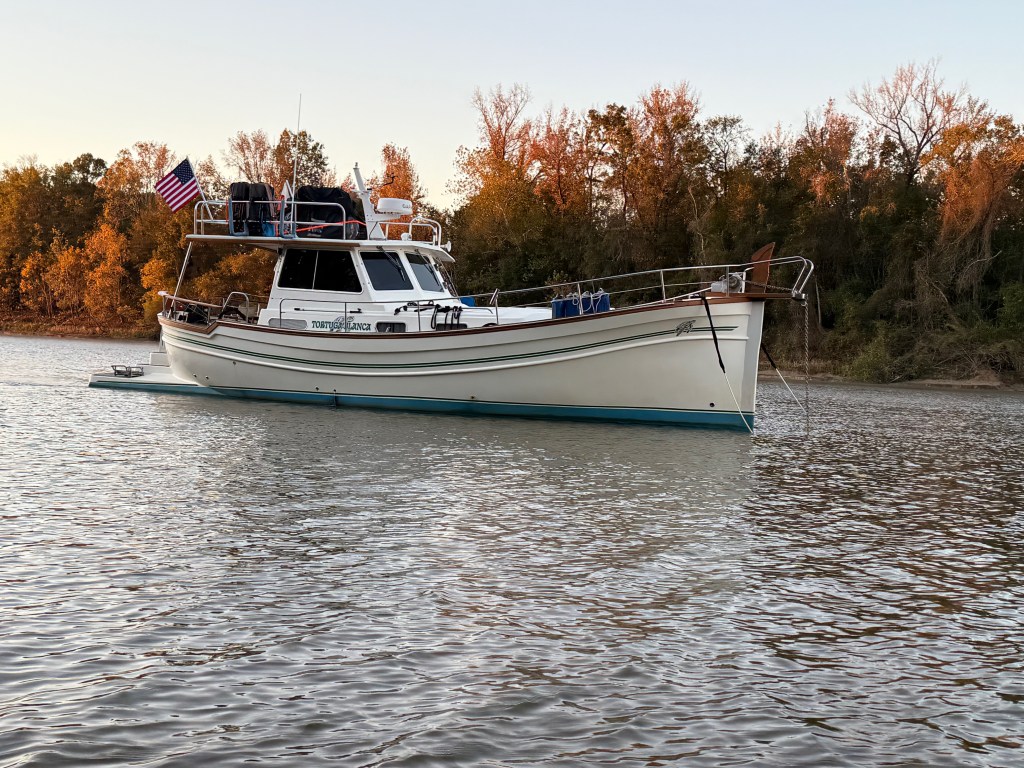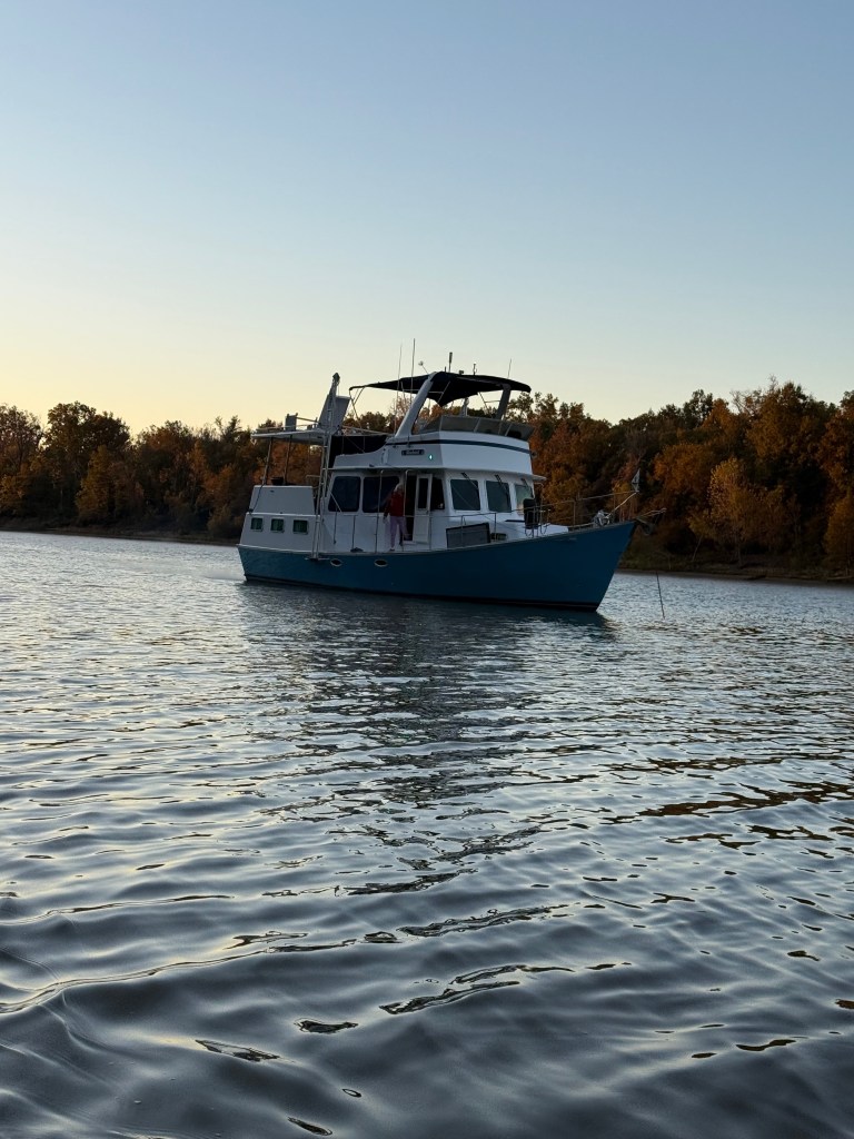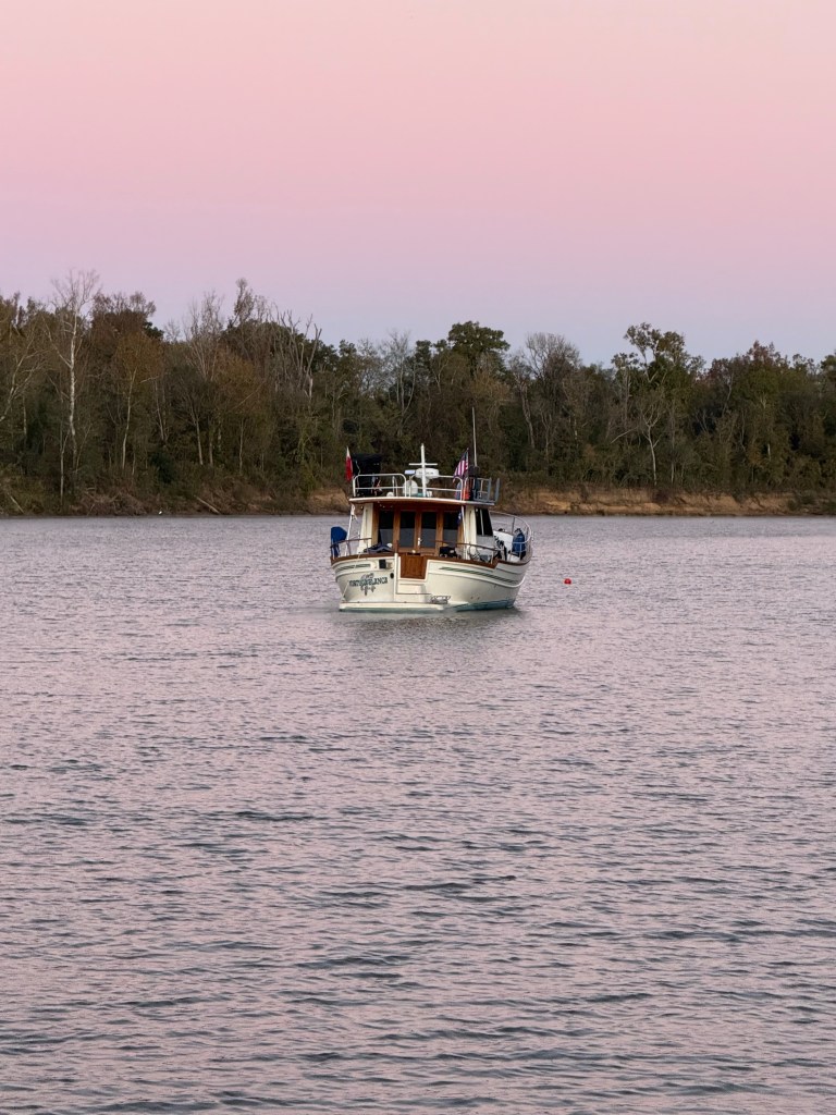 It was getting dark and we needed to anchor out. The more protected and well-known spots seemed to be taken and, just after we passed a tow we came upon a fellow Looper, Tortuga Blanco , anchored out just below a bend in the river. Taking up a spot in front of them, Hervey dropped the anchor and began to settle in. After remonstrances from the tow captain and from the very experienced captain of Tortuga Blanco, Hervey was encouraged to move behind our fellow looper and take a more protected position downstream and out of the curve of the river.